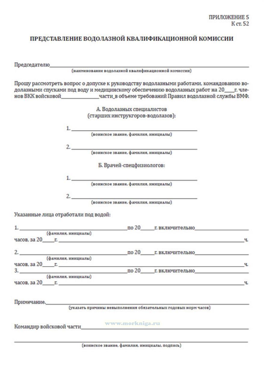 Форма бланка Представления водолазной квалификационной комиссии соответствует Приложению 5 к ПВС ВМФ Правилам водолазной службы военно морского флота 2002. Часть 1. Организация водолазного дела в ВМФ. Спуски на малые и средние глубины.