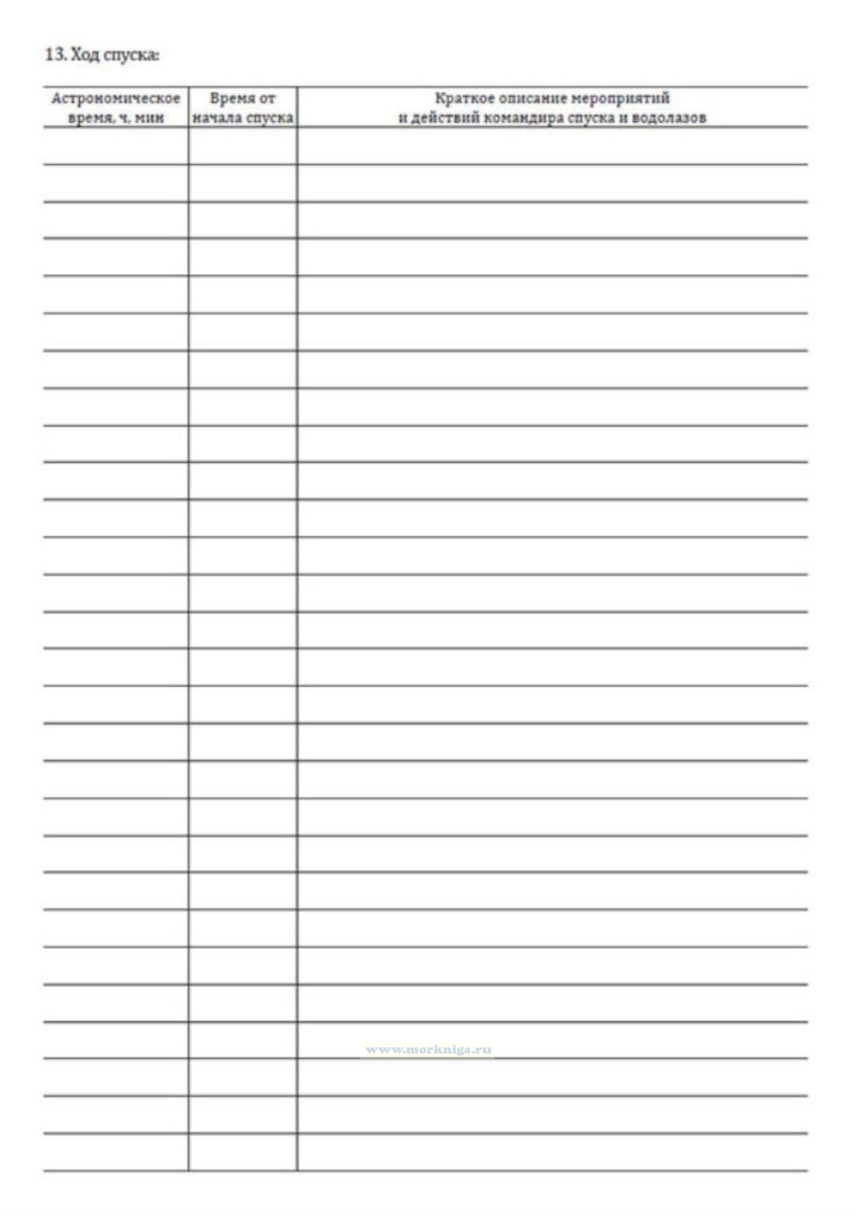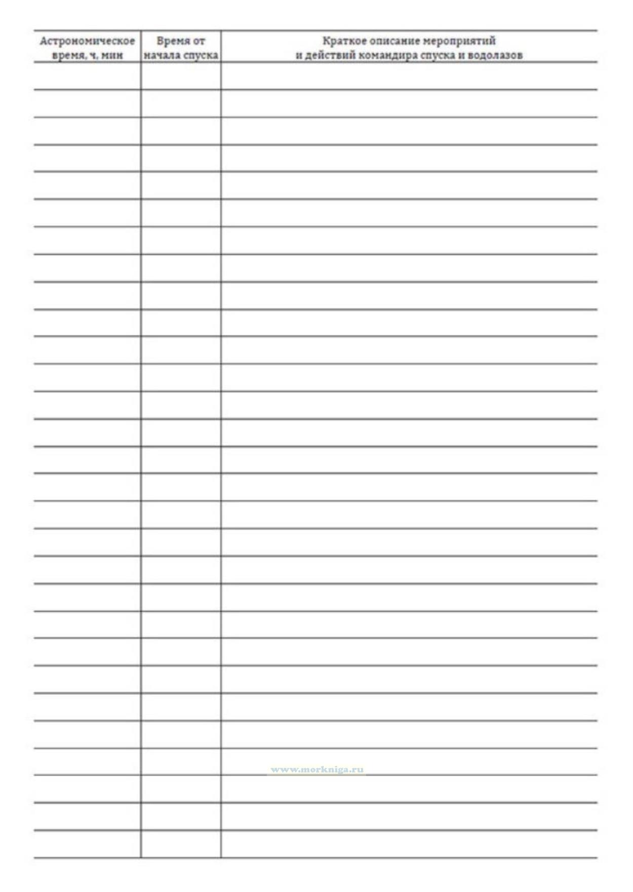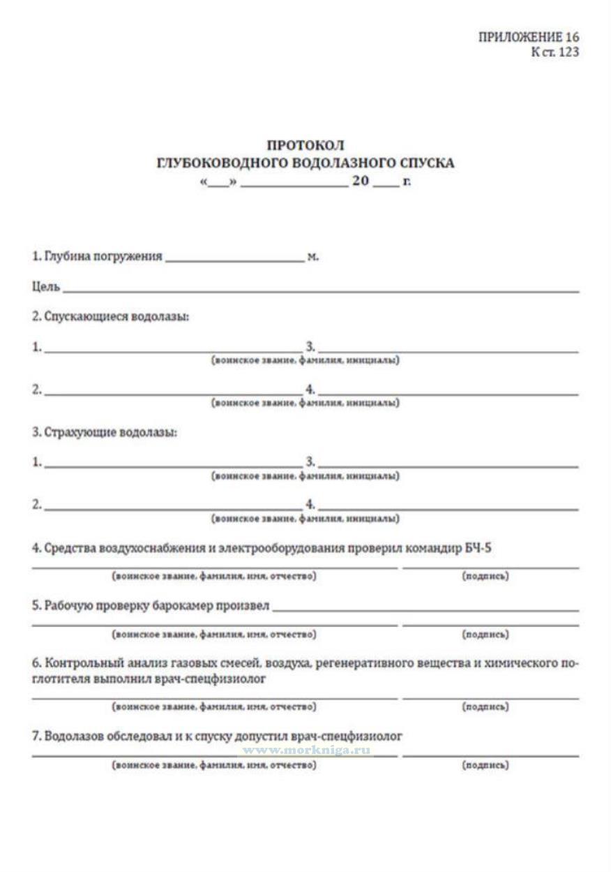 Форма Протокола глубоководного водолазного спуска соответствует Приложению 16 к ПВС ВМФ Правилам водолазной службы военно морского флота 2002. Часть 1. Организация водолазного дела в ВМФ. Спуски на малые и средние глубины и Приложению 3 к ПВС ВМФ Правилам водолазной службы военно морского флота 2002. Часть 1. Организация водолазного дела в ВМФ. Спуски на малые и средние глубины.
