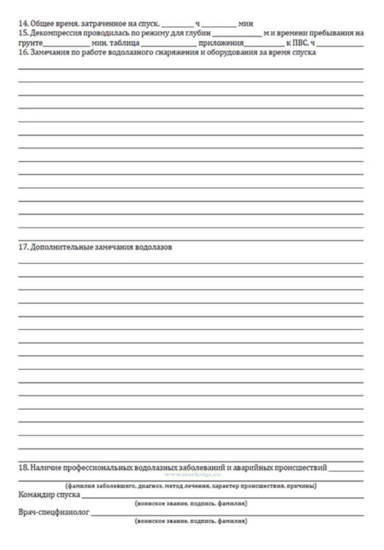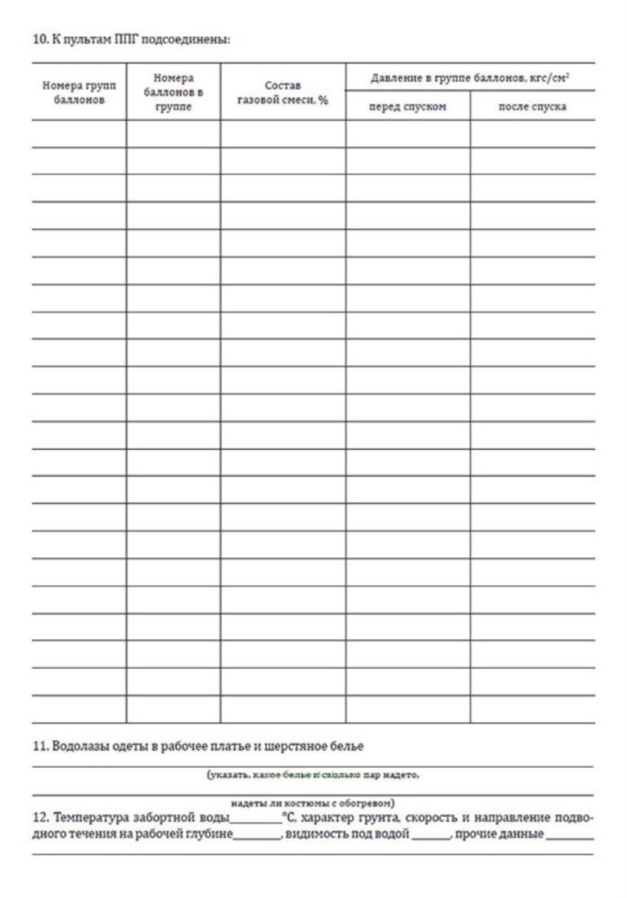 Учет времени пребывания водолазов (акванавтов, операторов) под водой и под повышенным давлением в барокамерах при глубоководных водолазных спусках, спусках методом ДП и спусках под воду в жестких водолазных устройствах ведется водолазным специалистом судна в журнале водолазных работ. Кроме этого, основные этапы подготовки и проведения спусков, описанных в данном разделе, должны фиксироваться врачом-спецфизиологом в протоколе глубоководных водолазных спусков, протоколе спуска акванавтов или протоколе спусков в жестком водолазном устройстве.