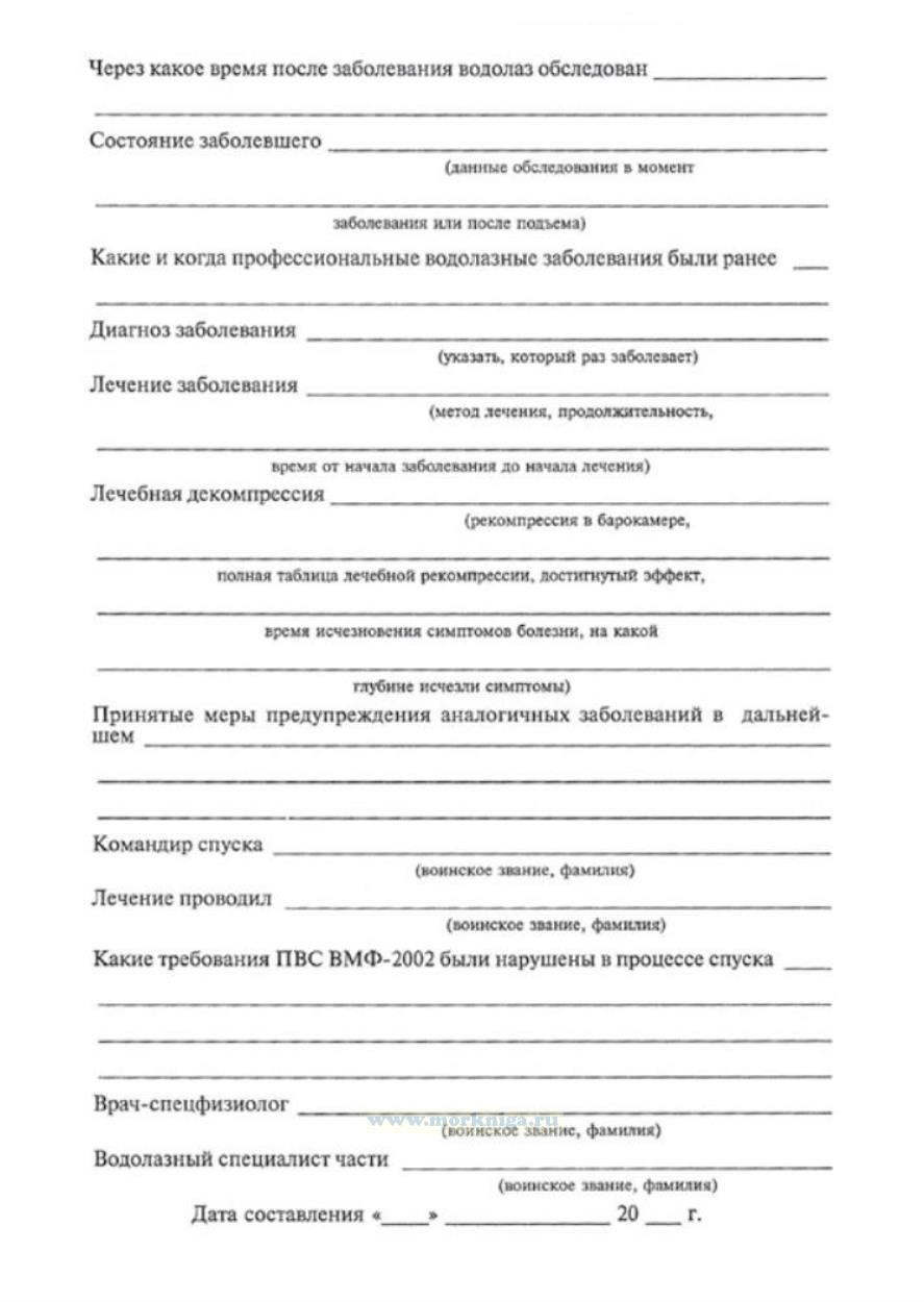 Форма бланка Карта учета профессиональных водолазных заболеванийсоответствует Приложению 6 к ПВС ВМФ Правилам водолазной службы военно морского флота 2002. Часть 2. Медицинское обеспечение водолазов военно-морского флота.