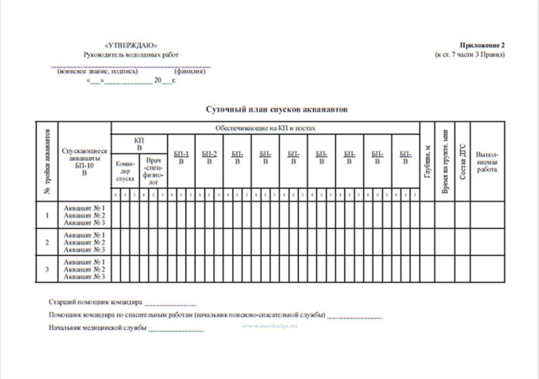 суточный план глубоководных водолазных спусков (приложение 1) или суточный план работы акванавтов (приложение 2);