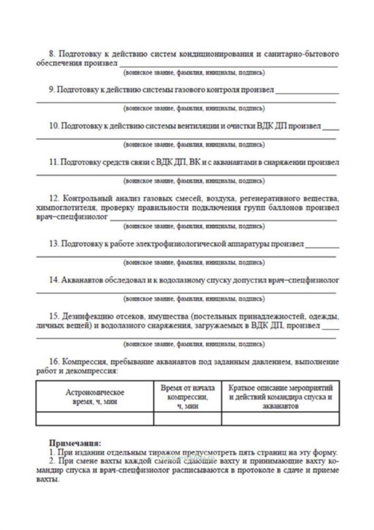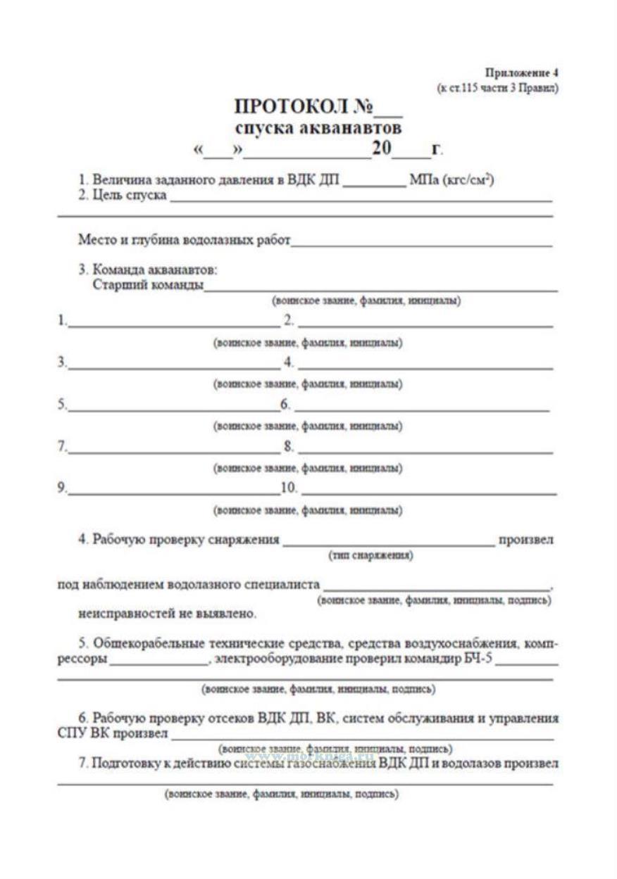 Форма бланка Протокола спуска акванавтов соответствует Приложению 4 к ПВС ВМФ Правилам водолазной службы военно морского флота 2002. Часть 3. Организация глубоководных водолазных спусков в ВМФ и их медицинское обеспечение.