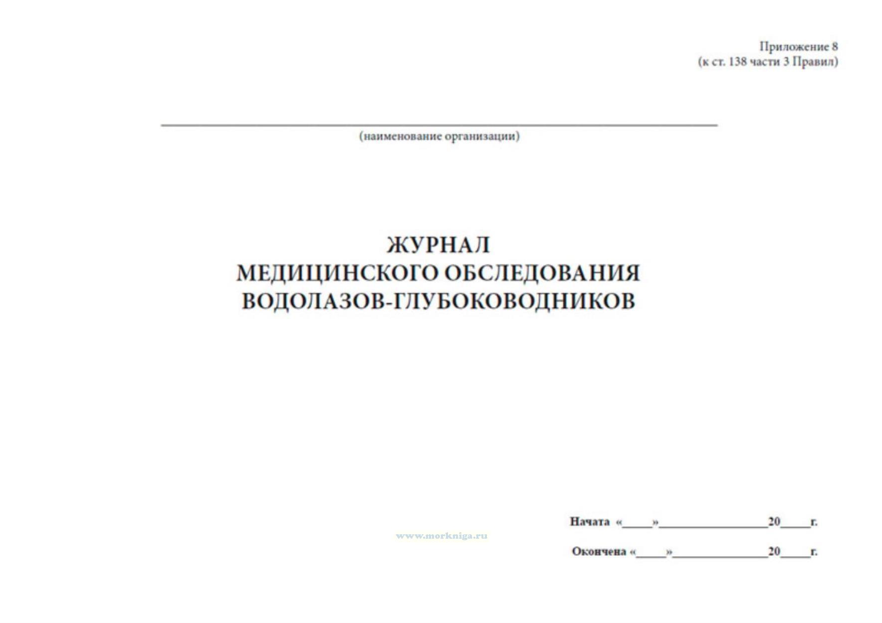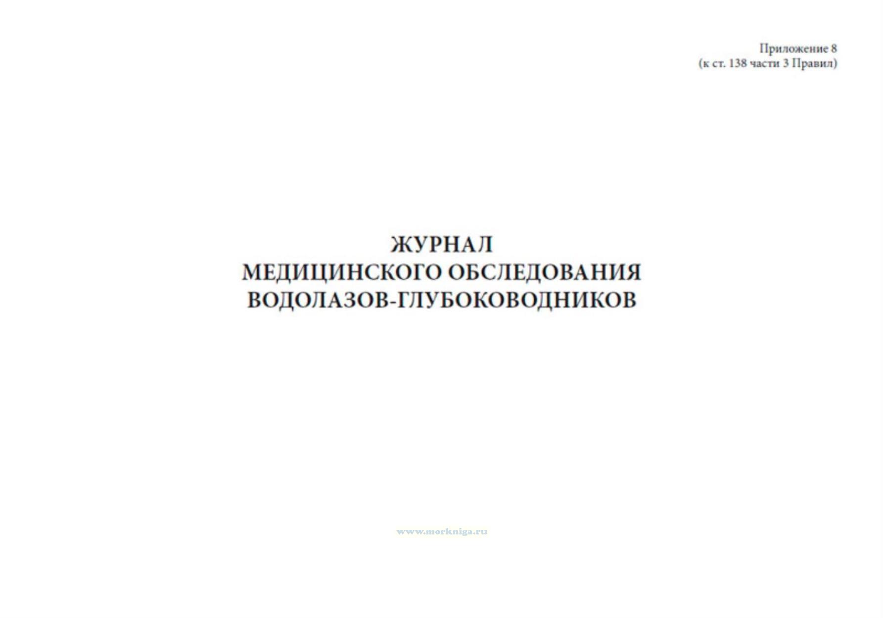 Форма журнала медицинского обследования водолазов-глубоководников соответствует Приложению 8 к ПВС ВМФ Правилам водолазной службы военно морского флота 2002. Часть 3. Организация глубоководных водолазных спусков в ВМФ и их медицинское обеспечение.