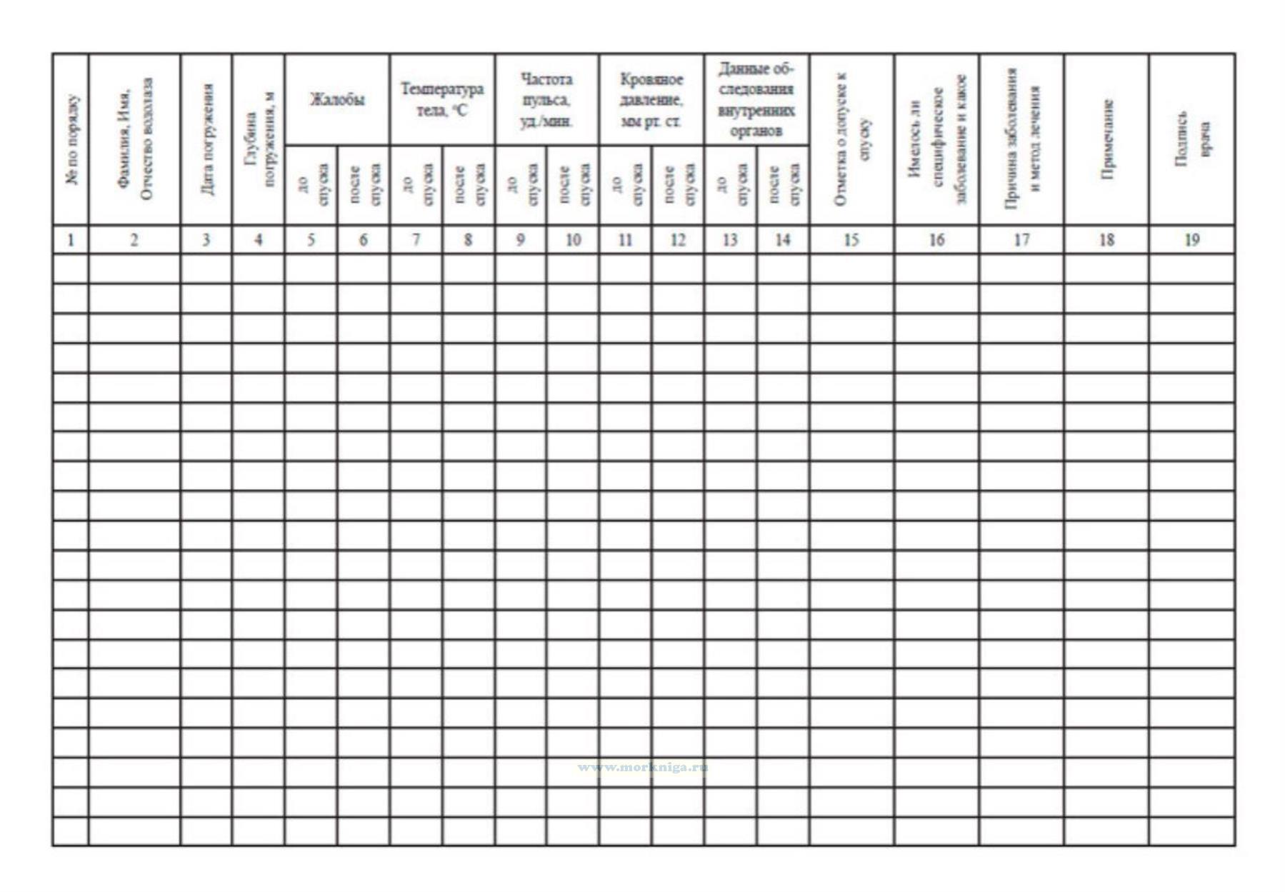 Результаты медицинского обследования до и после спуска заносят в журнал медицинского обследования водолазов-глубоководников.
