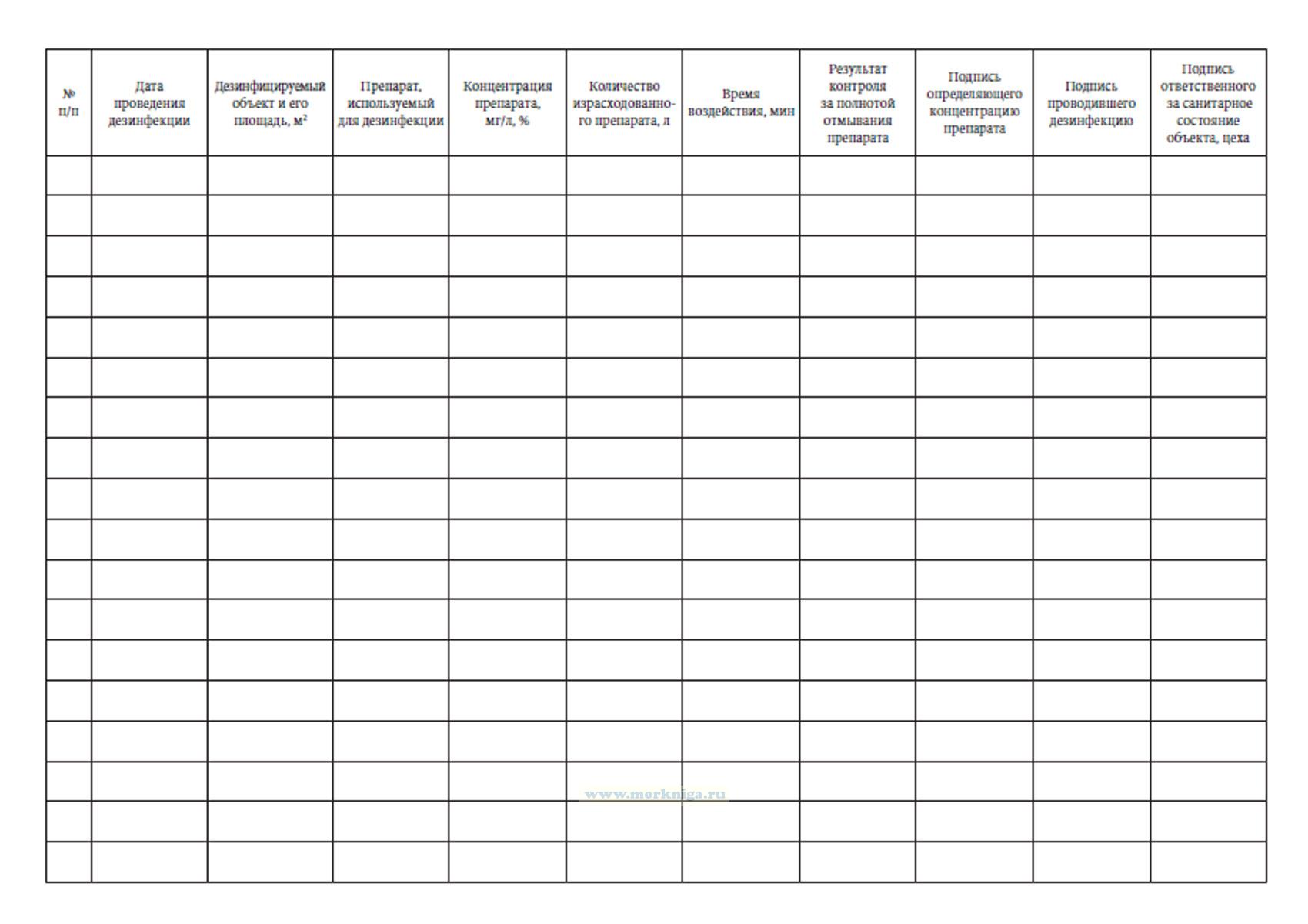 Форма журнала проведения дезинфекции соответствует Приложению 2 к Инструкции по санитарной обработке технологического оборудования на рыбообрабатывающих предприятиях и судах.