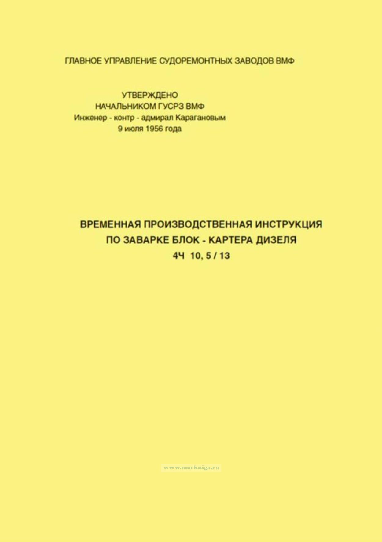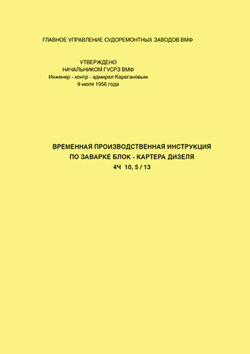 1. Настоящая инструкция определяет технологию ремонта с помощью сварки блок-картеров дизелей 4Ч 10,5/13, имеющих коррозионно-эрозионные повреждения на внутренних стенках, обращенных к распределительному валу и является обязательной для всех судоремонтных заводов ВМФ.