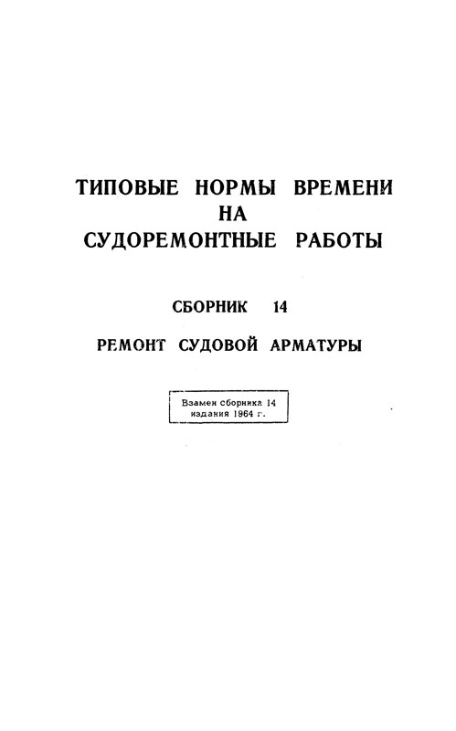 Настоящие Типовые нормы времени на судоремонтные работы (сборник 14, ремонт судовой арматуры) выпущены взамен "Типовых технически обоснованных норм времени на судоремонтные работы" (сборник 14, слесарно-арматурные работы) ВМФ, 1964.
