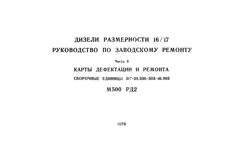 Документ Дизели размерности 16/17. Руководство по заводскому ремонту М500 РДп2 предназначен для заводского ремонта двигателей модификаций М503А, М503Б, М503В, М504А, М504Б, М517 и является руководящим документом для предприятий, ремонтирующих такие двигатели.