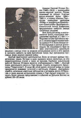 Предлагаемая в настоящем сборнике вниманию читателей единственная крупная работа одного из выдающихся деятелей Российского флота Н.О.Эссена "Краткий очерк деятельности флота в Порт-Артуре. Служба эскадренного броненосца "Севастополь"" снова выходит в свет через почти 90 лет после ее первой публикации и дает яркую картину обороны крепости глазами очевидца. "Биография" корабля, написанная известным публицистом и историком флота И.Л.Буничем, а также краткая историческая справка о Порт-Артуре позволяют получить более цельное представление о событиях на Дальнем Востоке на рубеже XIX-XX веков.