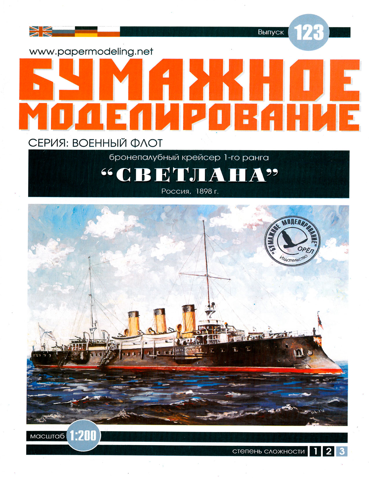 Крейсер 1 ранга «Светлана» был построен в 1895-1898 гг. во Франции, в городе Гавр, на судостроительном заводе фирмы «Форж э’Шантье» по заказу морского министерства России, заказавшего вооруженную яхту для генерал-адмирала великого князя Алексея Александровича. 2 марта 1904 г. «Светлана» была включена в состав 2-й Тихоокеанской эскадры. Крейсер возглавил разведывательный отряд, включавший в себя также крейсер II ранга «Алмаз» и вспомогательный крейсер «Урал». Назначение разведывательного отряда в Цусимском бою состояло в охранении транспортов, вследствие чего «Светлана» весь день 14 мая держалась между ними и противником. Через полчаса после вступления в бой от попадания снаряда крейсер «Светлана» получил подводную пробоину, в результате чего принял около 350 т воды и получил дифферент на нос 1,3 м. Около 7 часов утра крейсер «Светлана» на пути во Владивосток был обнаружен в районе острова Дажелет, а затем настигнут крейсерами «Нийтака», «Отова» и сопровождавшим их миноносцем. Бой продолжался около двух с половиной часов. Экипаж крейсера «Светлана» затопил корабль после потери хода и израсходования всего боезапаса. Подошедший через несколько часов в район боя крейсер «Америка-Мару» обнаружил и принял на борт экипаж «Светланы». Данная модель имеет высокий уровень деталировки, наличие двойной пропечатки листов. Присутствует печать бронзовой и медной краской, что придает модели большую реалистичность. Данное издание рассчитано на опытных моделистов.