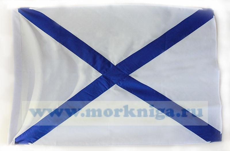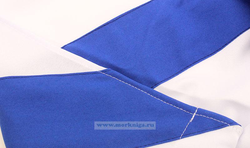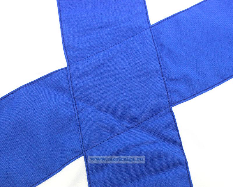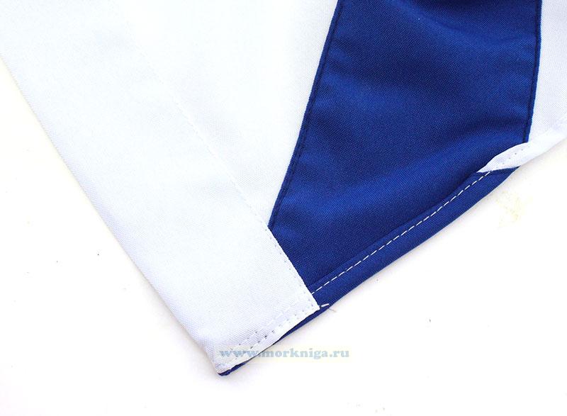 Флаг Андреевский, синие полосы пришиты к белому полотну с двух сторон. С одной стороны имеется отверстие, для вставки древка, которое в комплекте не идет.