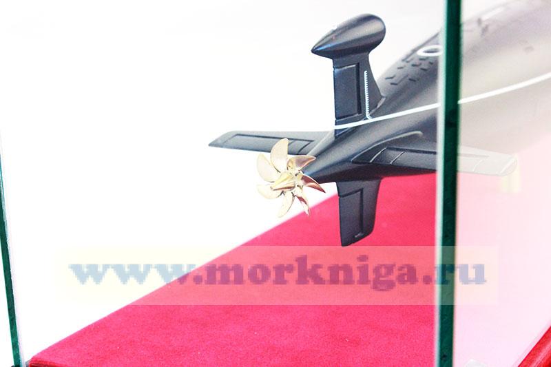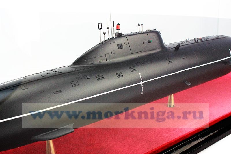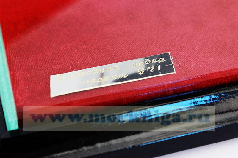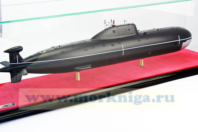 Модель атомной подводной лодки проекта 971 Материал: дерево, металл, пластик Размеры: Длина L=70 см Ширина B= 18 см Высота Н=19 см Масштаб 1:200 Изготовлена в г. Севастополе.