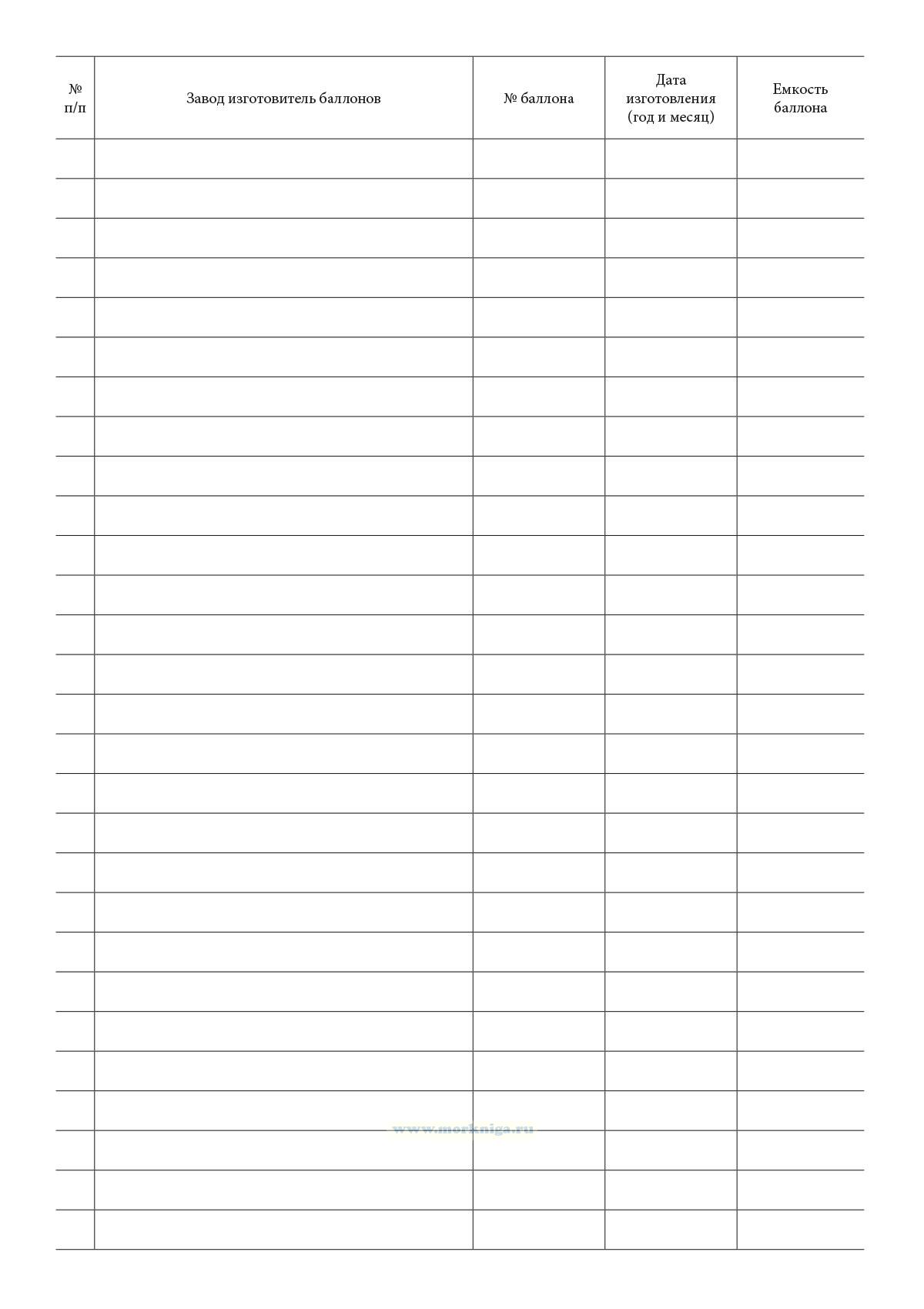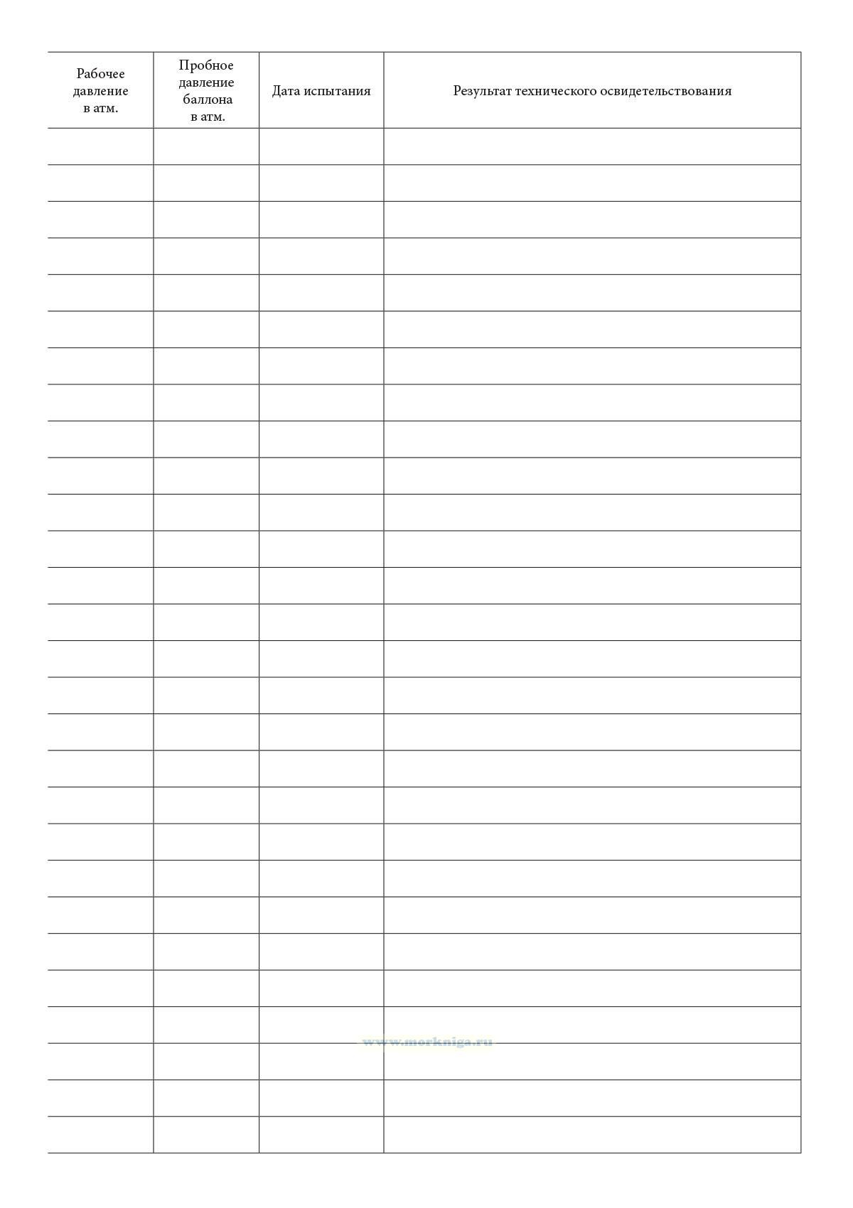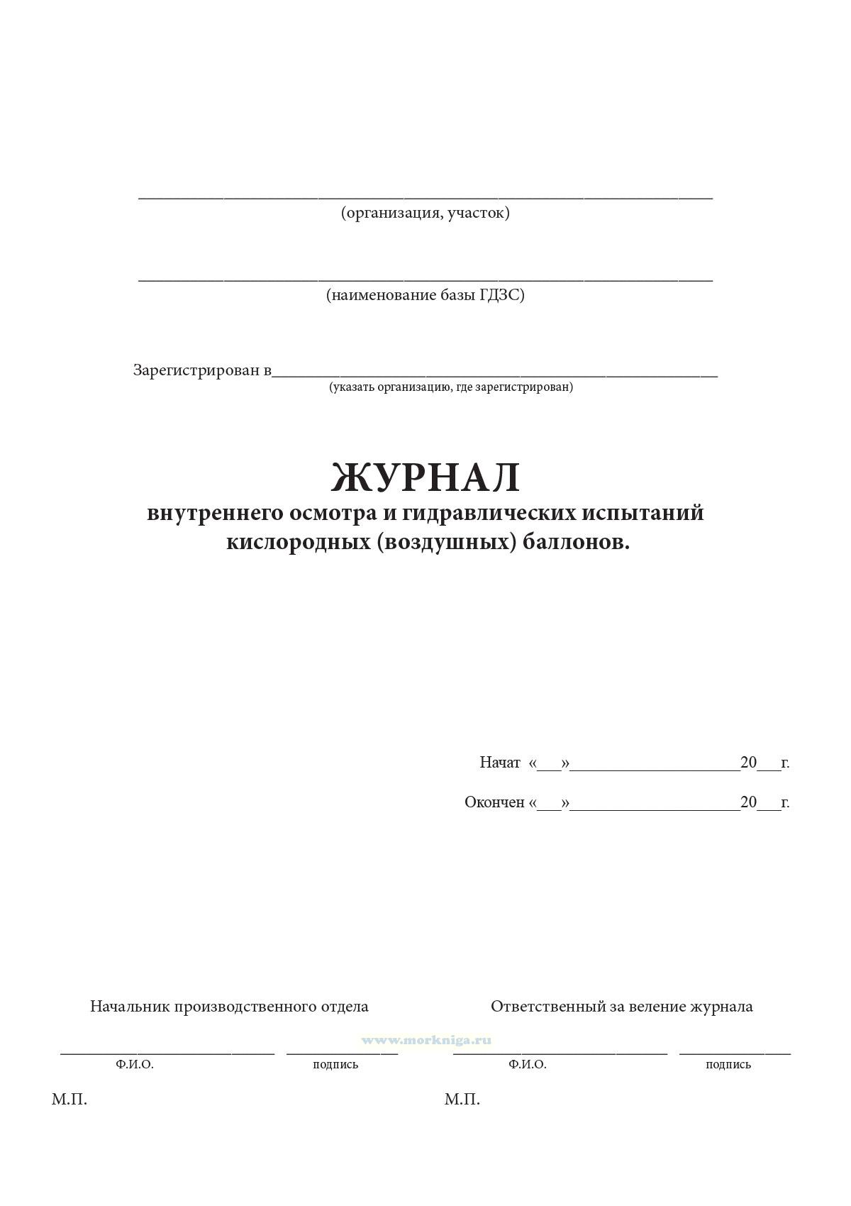 Форма журнала внутреннего осмотра и гидравлического испытания кислородных (воздушных) баллонов соответствует Приложению 9 к руководству Индивидуальные дыхательные аппараты изолирующего типа АСВ-2, КИП-8 используемые при тушении пожаров на судах.
