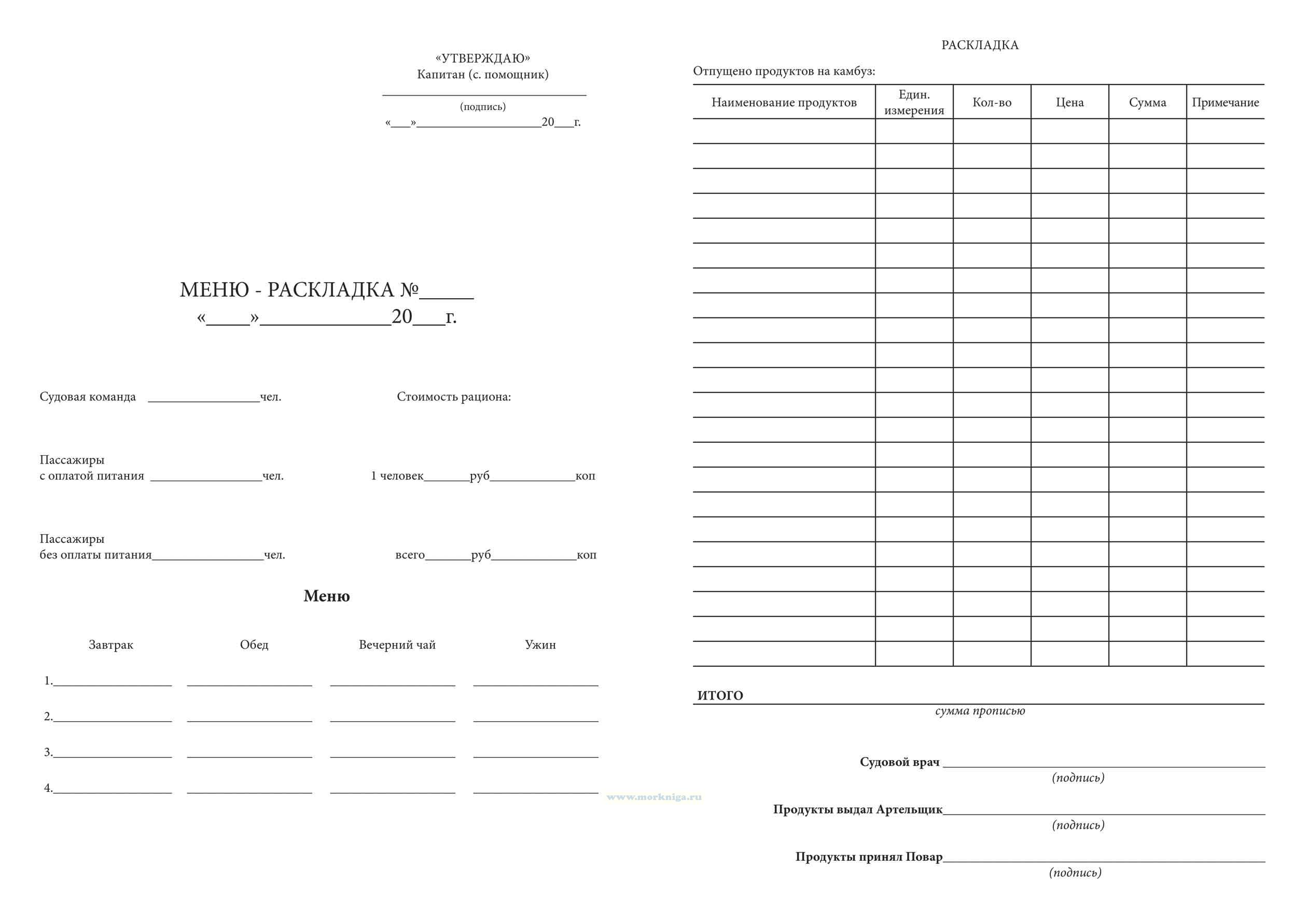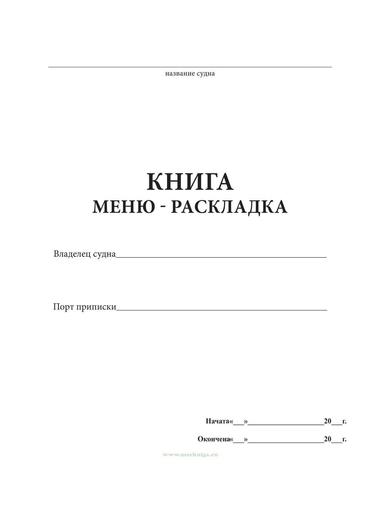 В книге записывается организации рационального питания экипажей судов, расчет сырья для меню и рецептуры приготовления блюд. Совместно утвержденное судовым врачом меню-раскладку продуктов питания экипажа.