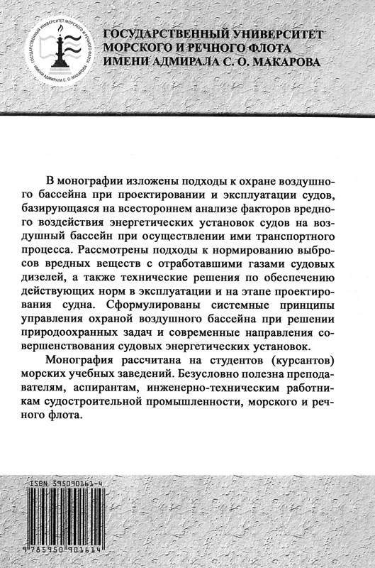 В монографии изложена концепция охраны воздушного бассейна при проектировании и эксплуатации судов, базирующаяся на всестороннем анализе факторов вредного воздействия энергетических установок судов на воздушный бассейн при осуществлении ими транспортного процесса.