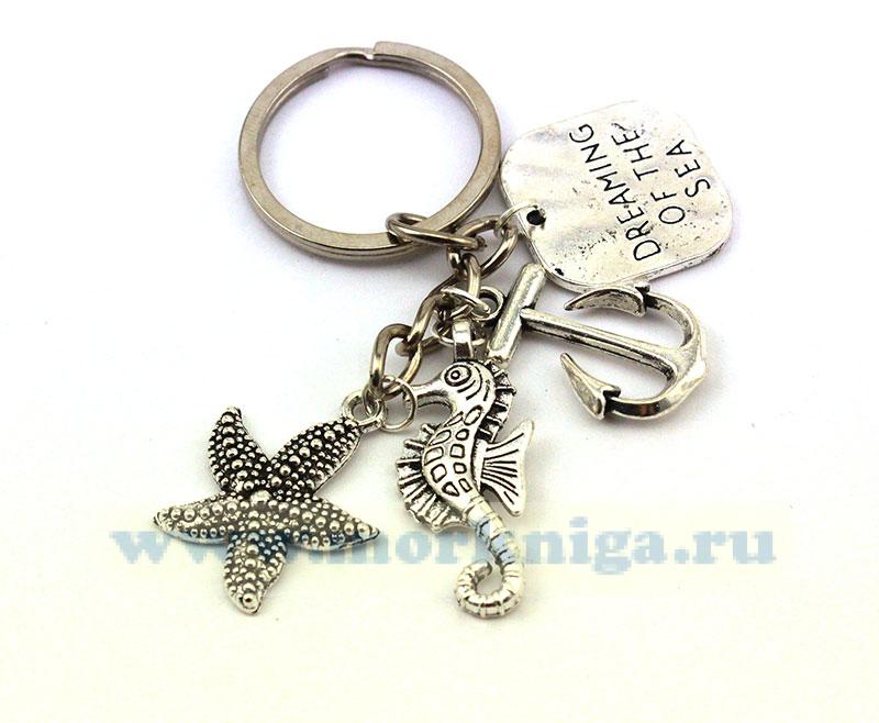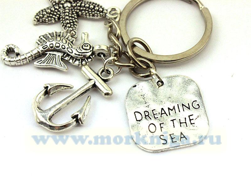 На брелке 4 украшения: адмиралтейский якорь, морской конек, морская звезда, табличка с надписью: Dreaming of the sea (Мечтая о море) Брелок станет украшением связки ключей каждой девушки, которая мечтает о романтике.