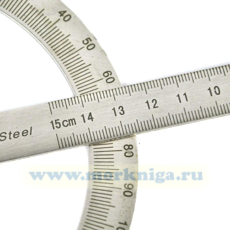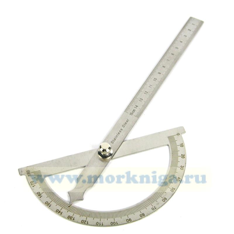 Толщина стали 1 мм Ширина транспортира 160 мм Общая длина 260 мм Позволяет измерять углы в пределах 0-360 градусов Погрешность измерения: 0,2 градуса