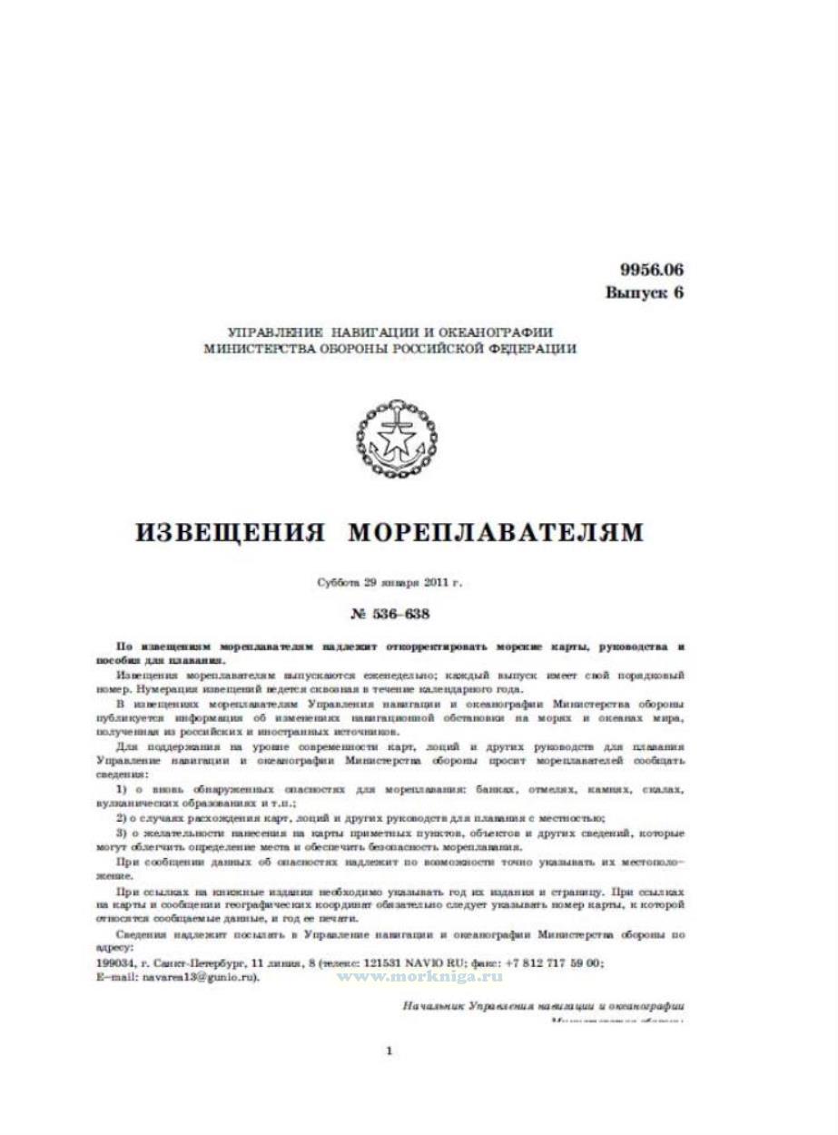 Извещения мореплавателям издаются Управлением навигации и океанографии Минобороны России еженедельными выпусками. В выпусках ИМ УНиО Минобороны России публикуется навигационная информация, предназначенная для поддержания на уровне современности морских навигационных карт, лоций и других руководств для плавания, полученная из иностранных и российских источников. Полный перечень извещений мореплавателям за 2011 год находиться в Нумернике за 2011 год