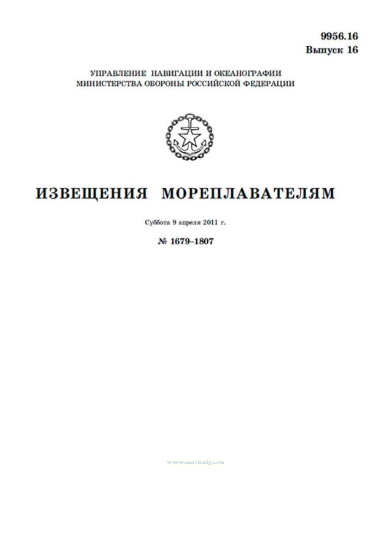 Извещения мореплавателям. Выпуск 16. № 1679-1807 (от 9 апреля 2011 г.) Адм. 9956.16