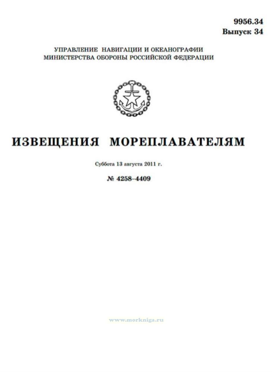 Извещения мореплавателям. Выпуск 34. № 4258-4409 (от 13 августа 2011 г.) Адм. 9956.34