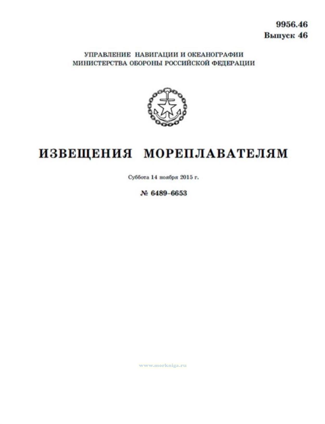 Извещения мореплавателям. Выпуск 46. № 6489-6653 (от 14 ноября 2015 г.) Адм. 9956.46