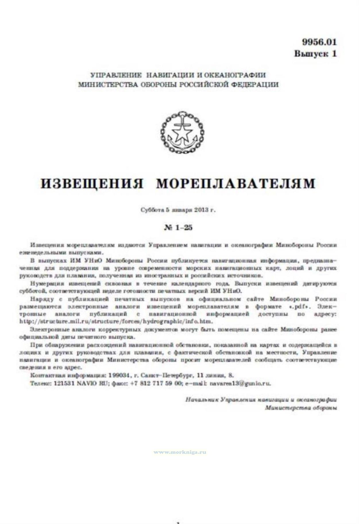 Извещения мореплавателям. Выпуск 1. № 1-25 (от 5 января 2013 г.) Адм. 9956.01