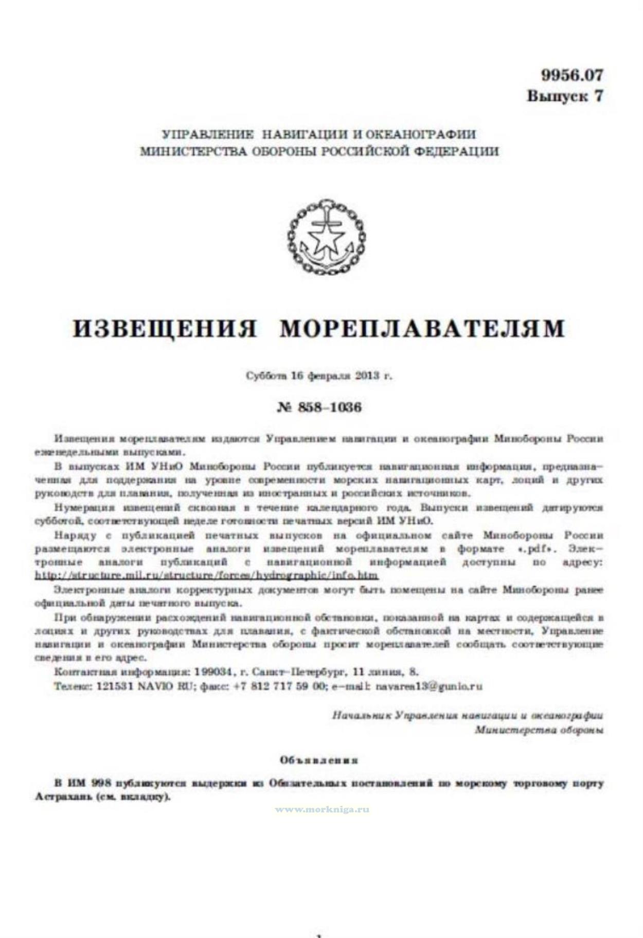 Извещения мореплавателям издаются Управлением навигации и океанографии Минобороны России еженедельными выпусками. В выпусках ИМ УНиО Минобороны России публикуется навигационная информация, предназначенная для поддержания на уровне современности морских навигационных карт, лоций и других руководств для плавания, полученная из иностранных и российских источников. Полный перечень извещений мореплавателям за 2013 год находиться в Нумернике за 2013 год