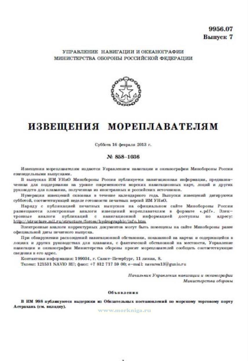 Извещения мореплавателям издаются Управлением навигации и океанографии Минобороны России еженедельными выпусками.