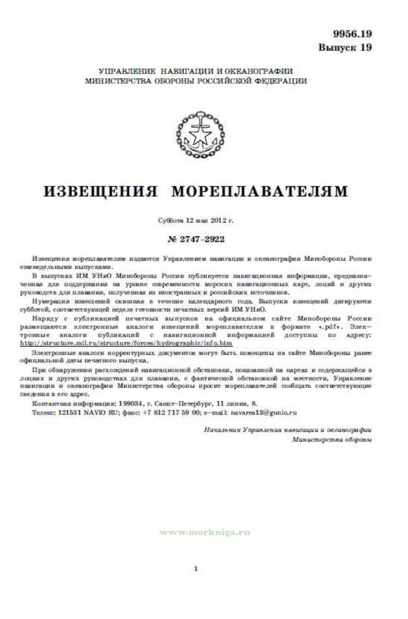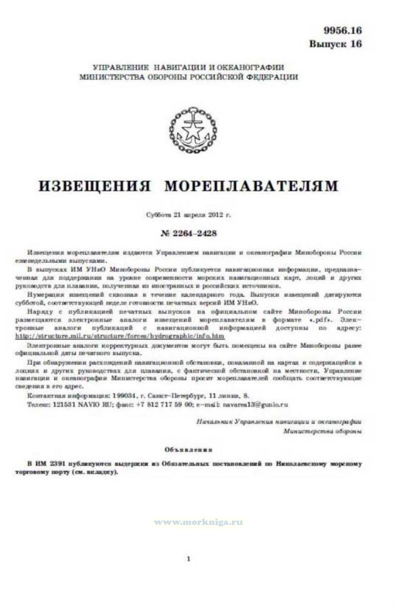 Извещения мореплавателям издаются Управлением навигации и океанографии Минобороны России еженедельными выпусками. В выпусках ИМ УНиО Минобороны России публикуется навигационная информация, предназначенная для поддержания на уровне современности морских навигационных карт, лоций и других руководств для плавания, полученная из иностранных и российских источников. Полный перечень извещений мореплавателям за 2012 год находиться в Нумернике за 2012 год