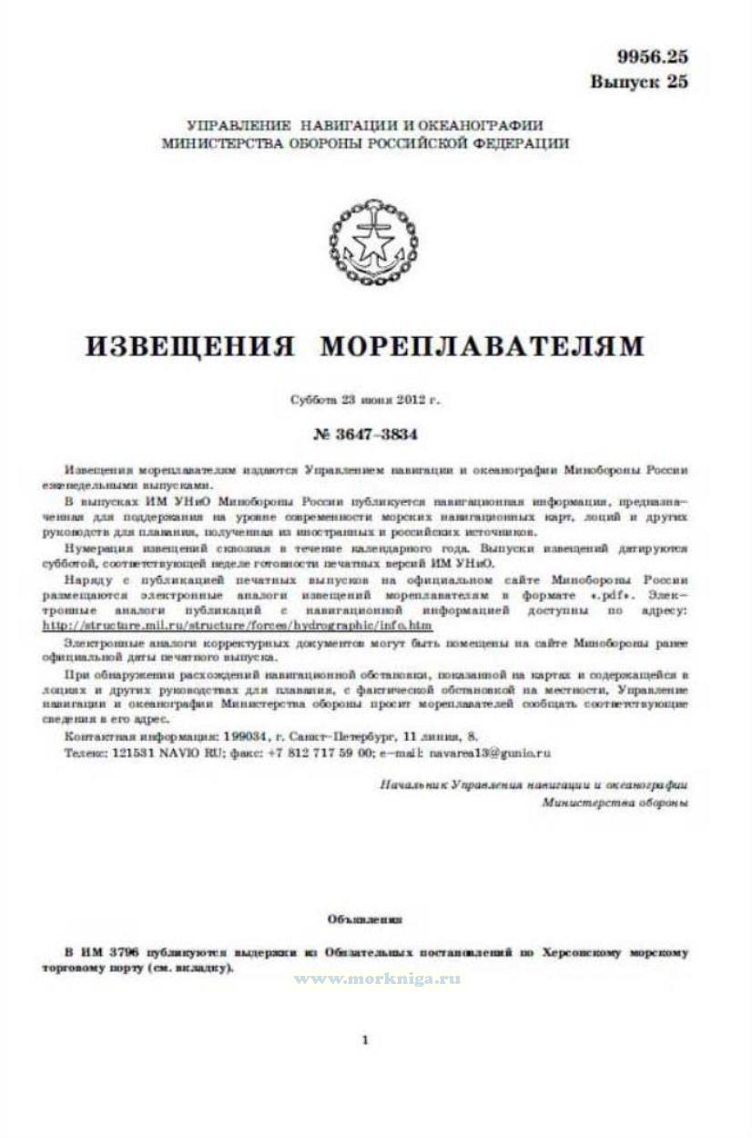 Извещения мореплавателям. Выпуск 25. № 3647-3834 (от 23 июня 2012 г.) Адм. 9956.25
