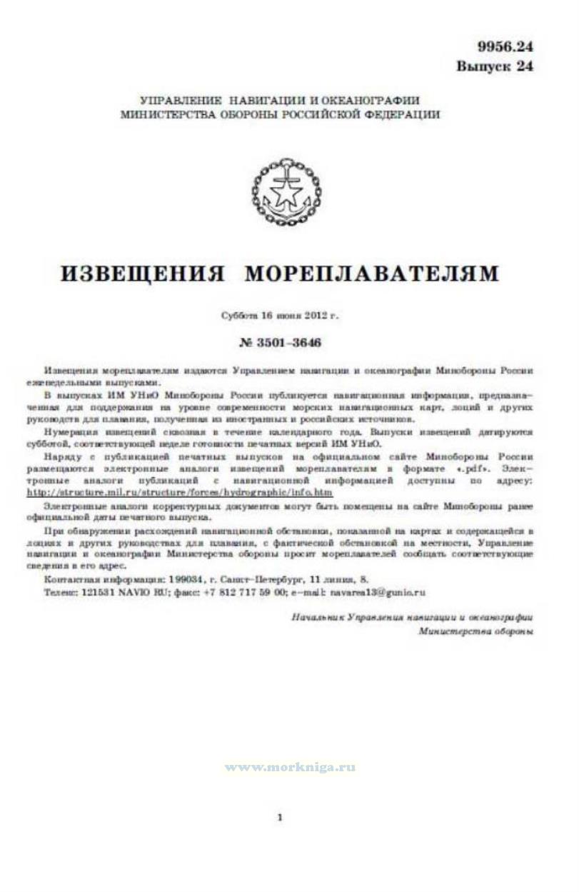 Извещения мореплавателям издаются Управлением навигации и океанографии Минобороны России еженедельными выпусками. В выпусках ИМ УНиО Минобороны России публикуется навигационная информация, предназначенная для поддержания на уровне современности морских навигационных карт, лоций и других руководств для плавания, полученная из иностранных и российских источников. Полный перечень извещений мореплавателям за 2012 год находиться в Нумернике за 2012 год