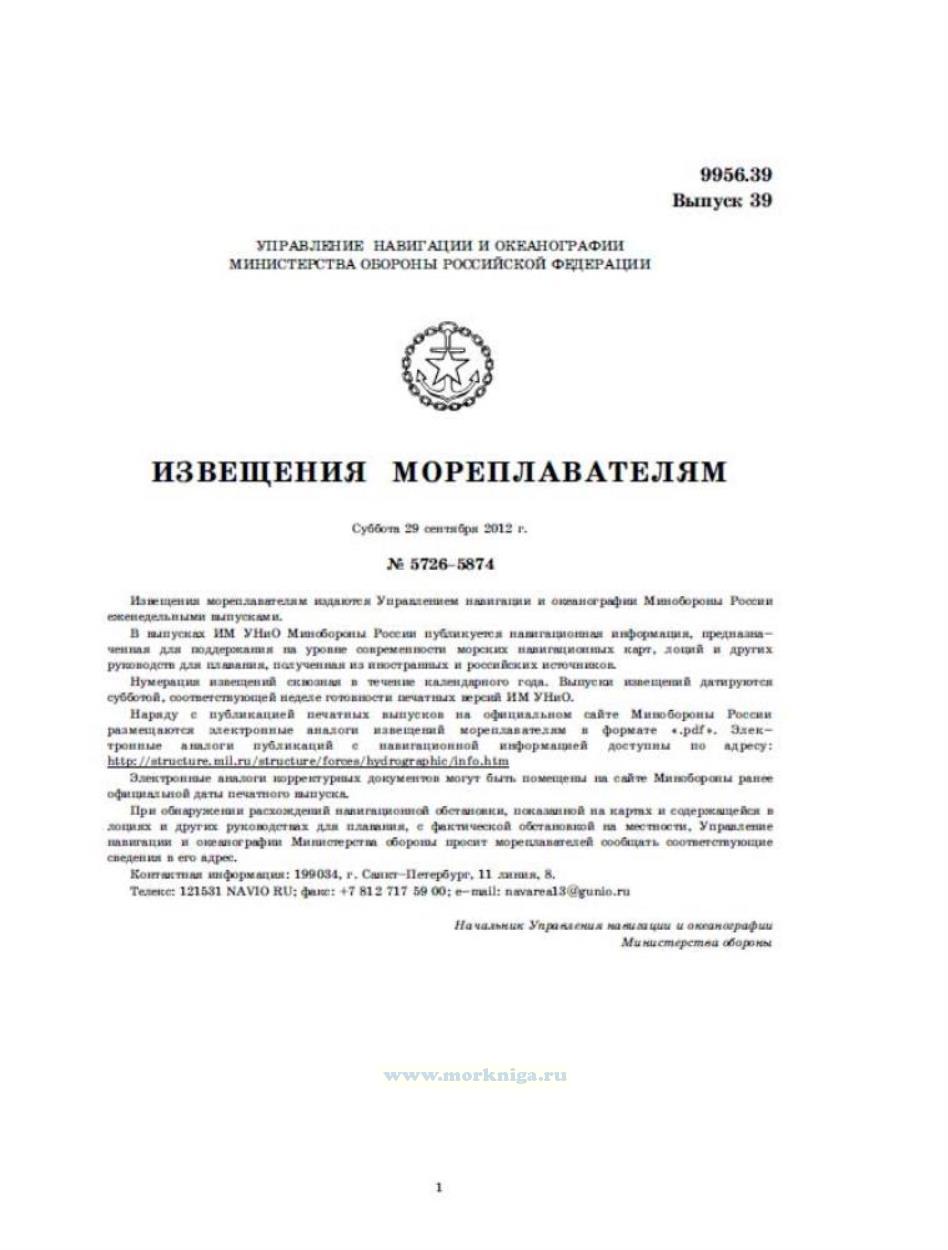 Извещения мореплавателям. Выпуск 39. № 5726-5874 (от 29 сентября 2012 г.) Адм. 9956.39