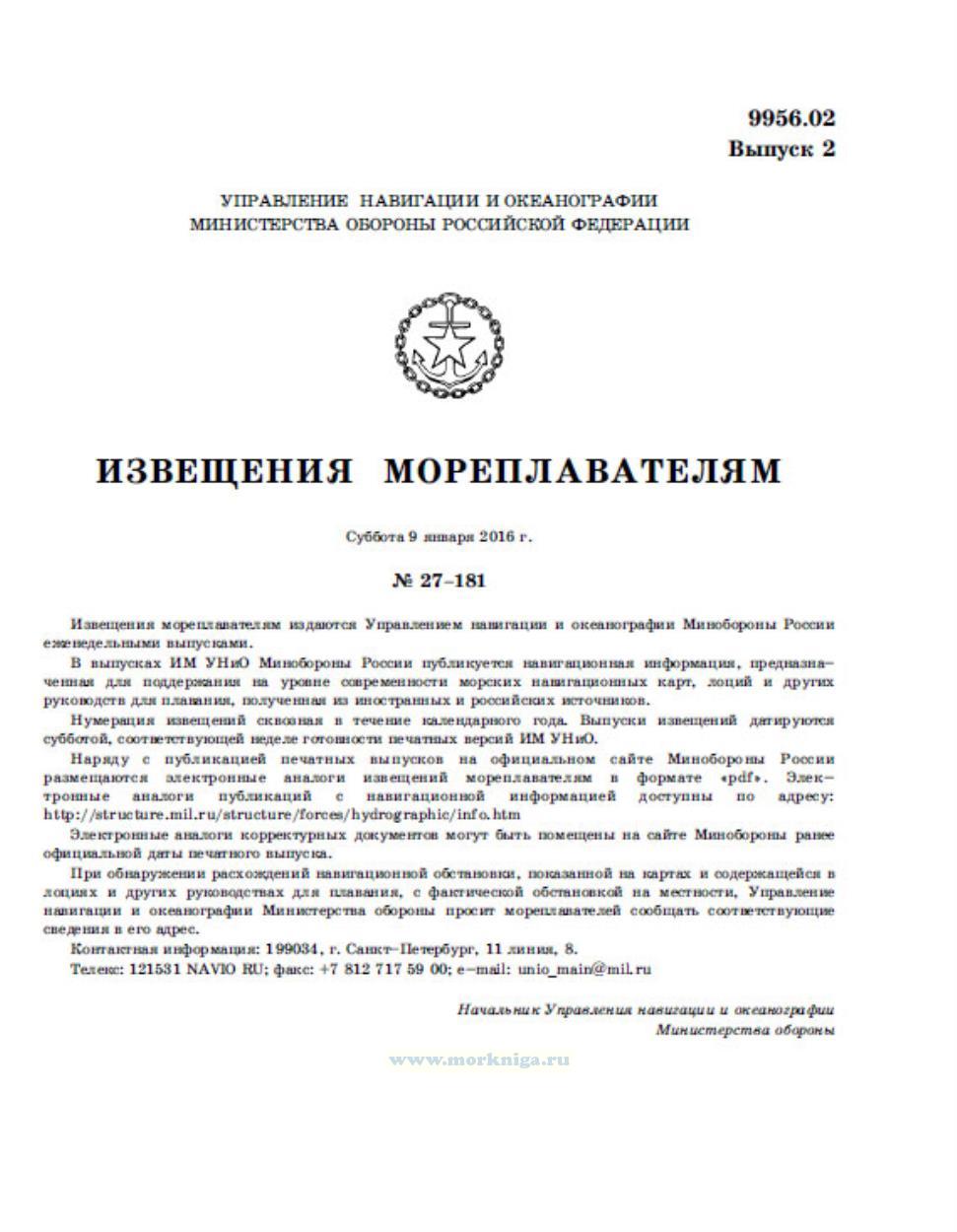 Извещения мореплавателям издаются Управлением навигации и океанографии Минобороны России еженедельными выпусками. В выпусках ИМ УНиО Минобороны России публикуется навигационная информация, предназначенная для поддержания на уровне современности морских навигационных карт, лоций и других руководств для плавания, полученная из иностранных и российских источников. Полный перечень извещений мореплавателям за 2016 год находиться в Нумернике за 2016 год