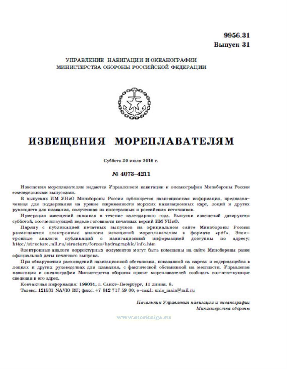 Извещения мореплавателям издаются Управлением навигации и океанографии Минобороны России еженедельными выпусками. В выпусках ИМ УНиО Минобороны России публикуется навигационная информация, предназначенная для поддержания на уровне современности морских навигационных карт, лоций и других руководств для плавания, полученная из иностранных и российских источников. Полный перечень извещений мореплавателям за 2016 год находиться в Нумернике за 2016 год