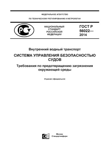 "ГОСТ Р 56022-2014. Национальный стандарт Российской Федерации. Внутренний водный транспорт. Система управления безопасностью судов. Требования по предотвращению загрязнения окружающей среды" утв. и введен в действие Приказом Росстандарта от 19.05.2014 N 434-ст