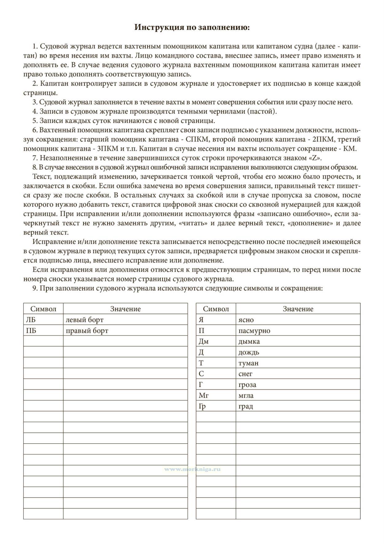 Судовой журнал ведется вахтенным помощником капитана или капитаном судна во время несения им вахты. Лицо командного состава, внесшее запись, имеет право изменять и дополнять ее. В случае ведения судового журнала вахтенным помощником капитана капитан имеет право только дополнять соответствующую запись.