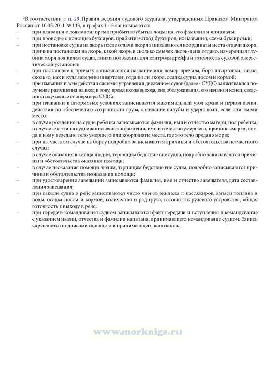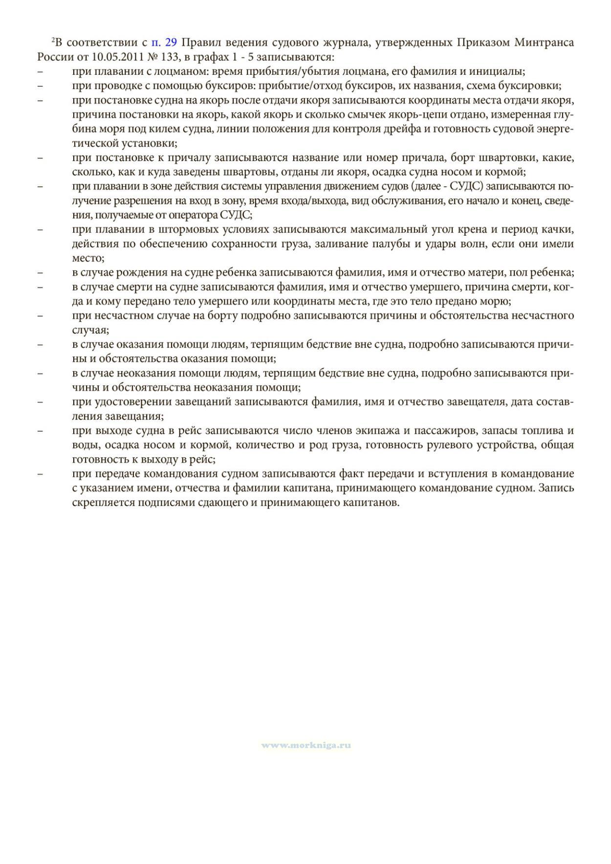 В соответствии с п. 29 Правил ведения судового журнала, утвержденных Приказом Минтранса России от 10.05.2011 N 133, в графах 1 - 5 записываются: