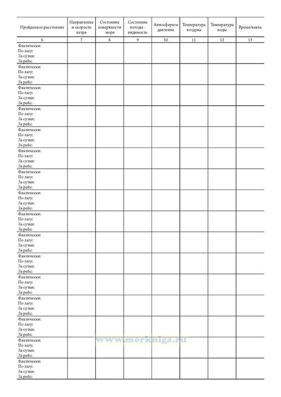 при выходе судна в рейс записываются число членов экипажа и пассажиров, запасы топлива и воды, осадка носом и кормой, количество и род груза, готовность рулевого устройства, общая готовность к выходу в рейс;