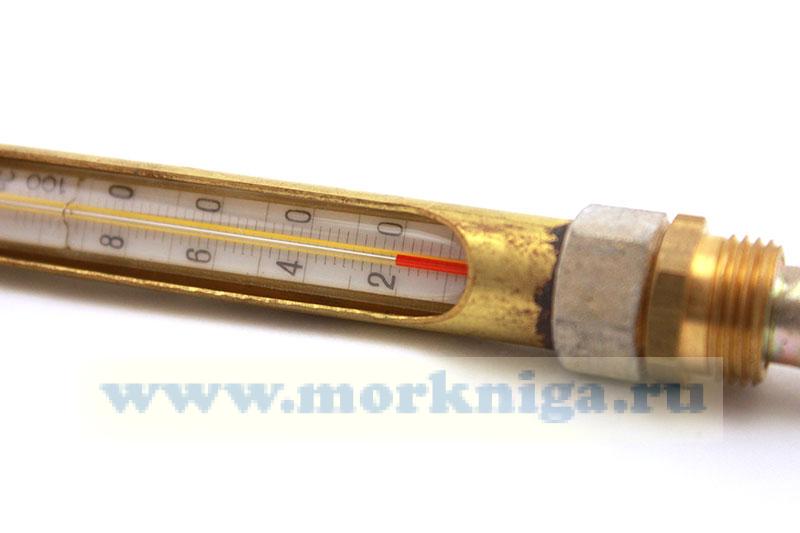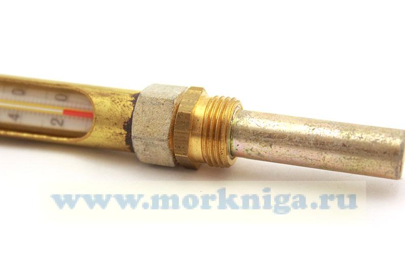 Сам термометр стекляный, помещен в защитный латунный корпус.