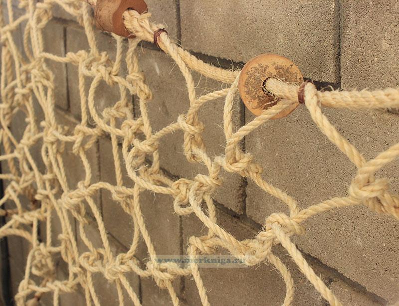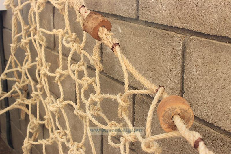 Материал сети (ячейки) - сизаль , Окантовка- канат джутовый натуральный d= 14 мм, оригинальные поплавки, которые отслужили свой срок на настоящей рыбловной сети и выбелены морем.