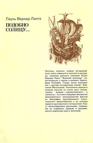 Читатель, конечно, помнит интереснейшую книгу немецкого писателя и историка, а также капитана дальнего плавания Пауля Вернера Ланге "Великий скиталец", повествующую о жизни и деяниях Христофора Колумба. Теперь автор знакомит нас с другим покорителем стихий - Фернаном Магелланом. Написанная живым и сочным языком на стыке двух литературных жанров - художественного и научного,- эта книга содержит множество малоизвестных неспециалистам фактов из биографии прославленного португальского мореплавателя и из истории первого кругосветного путешествия.