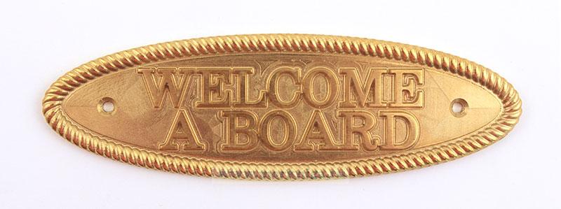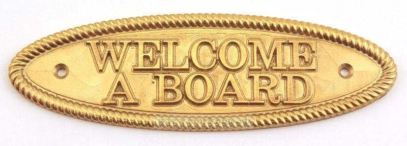 Табличка "Welcome а board" (в переводе с англ. - "Добро пожаловать на борт") создана в золотистом цвете, служит информационным указателем.