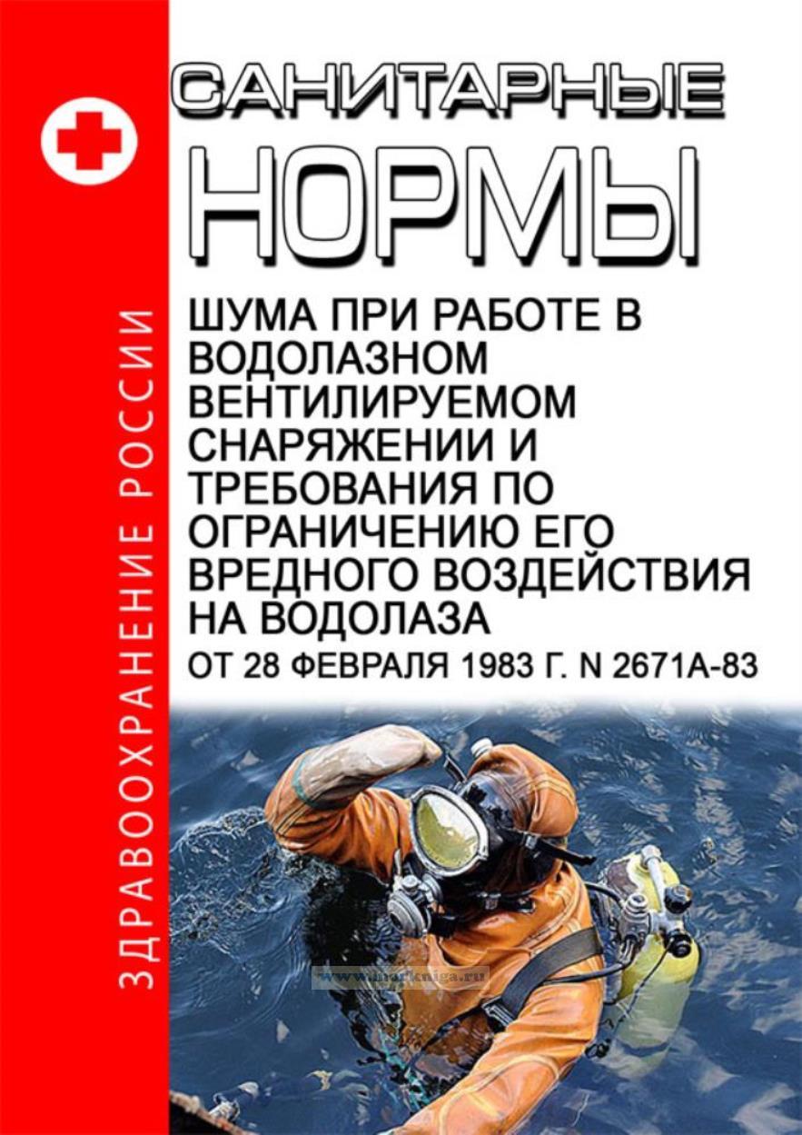 Санитарные нормы шума при работе в водолазном вентилируемом снаряжении и требования по ограничению его вредного воздействия на водолаза от2 8 февраля 1983 г. N 2671а-83, распространяются на проектируемое, изготовляемое и эксплуатируемое водолазное снаряжение вентилируемого типа, предназначенное для использования на глубинах погружения до 60 м при дыхании водолаза воздухом