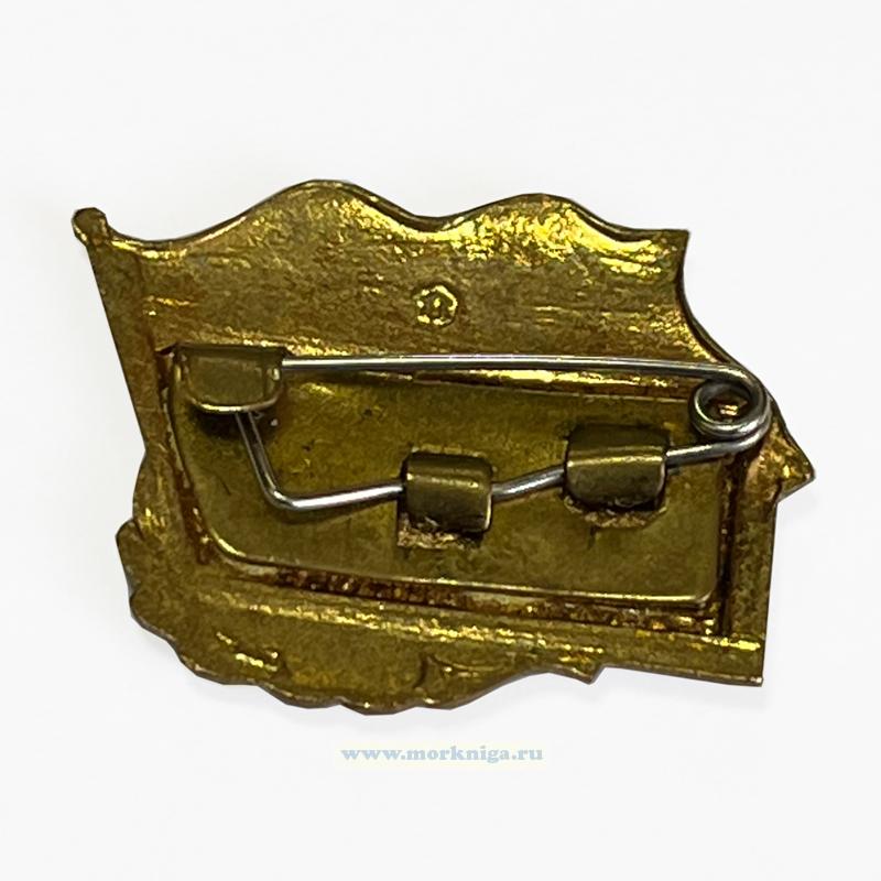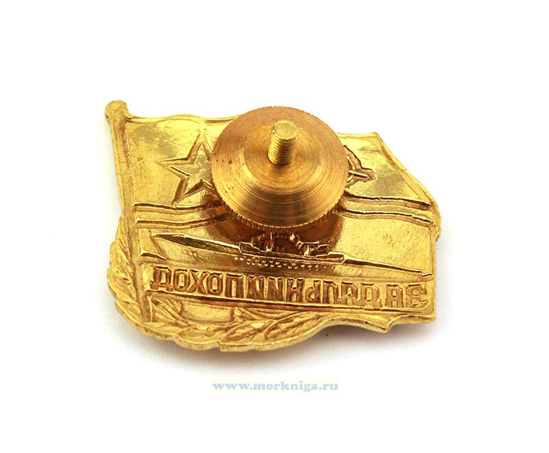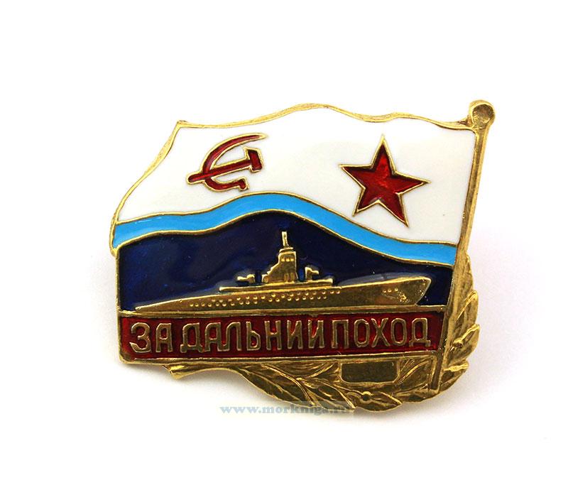 Знак выполнен в форме прямоугольной пластинки, прикрытой сверху развевающимся вправо военно-морским флагом СССР образца 27 мая 1935 г. Левую сторону пластинки ограничивает стоящий наклонно флагшток. По центру размещен силуэт всплывшей подводной лодки стального цвета. По нижней кромке пластинки идет красная полоса с золотистой надписью: "за дальний поход". Левый нижний угол пластинки обрамлен лавровой ветвью. Фацет знака, все кромки, буртики и лавровая ветвь имеют золотистый цвет.