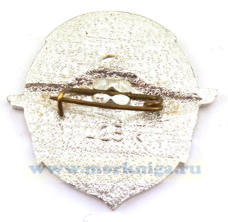 Знак имеет форму круга, наложенного поверх якоря. По центру объемное изображение подводной лодки на голубом фоне.