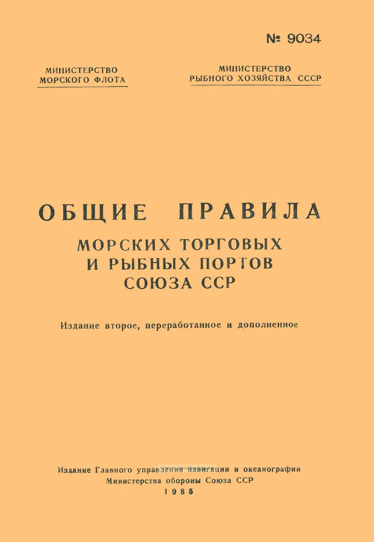 Общие правила морских торговых и рыбных портов Союза ССР разработаны Центральным научно-исследовательским институтом морского флота (ЦНИИМФ), согласованы с Главным штабом Военно-Морского Флота СССР, Главным управлением пограничных войск Комитета государственной безопасности СССР, утверждены Министерством морского флота и Министерством рыбного хозяйства СССР и вводятся в действие с 1 января 1986 г