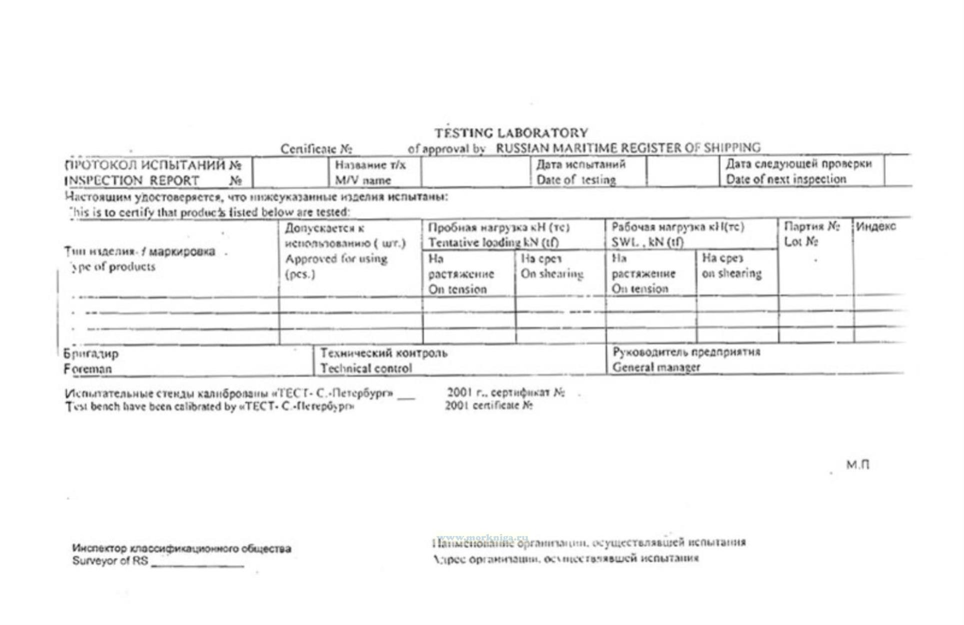 Форма протокола испытаний соответствует приложению Б РД 31.55.01-2002 Средства многооборотные для крепления грузов на морских судах Технические требования