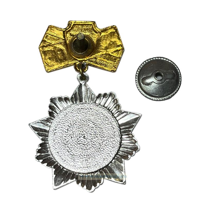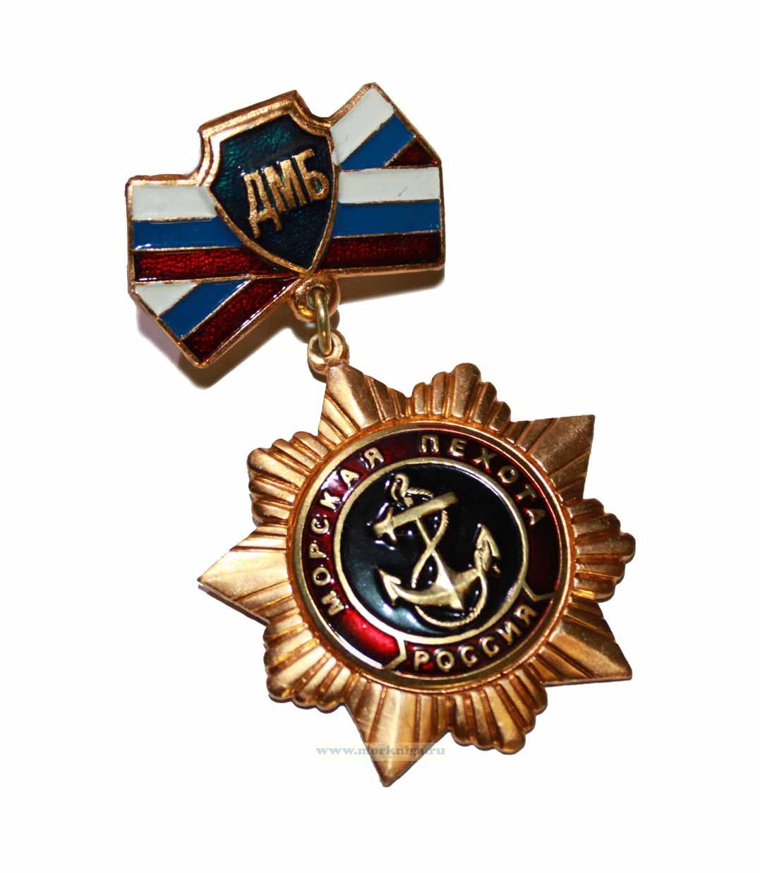 Знак выполнен в форме десятиконечной звезды, по центру круг, на нем изображен якорь, полукругом выполнена надпись. Знак крепится к колодке с перекрещенными флагами РФ, по центру которой помещен щит с надписью «ДМБ».