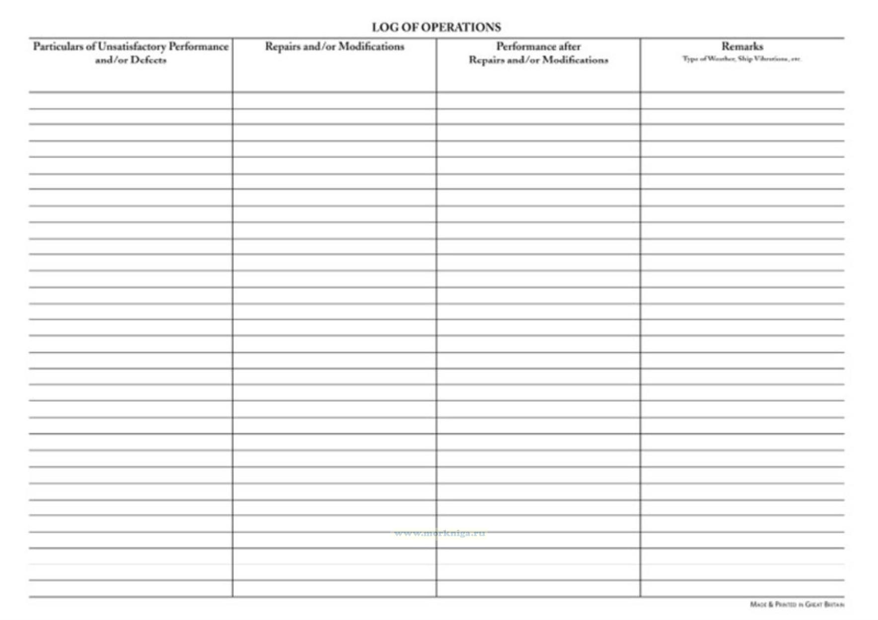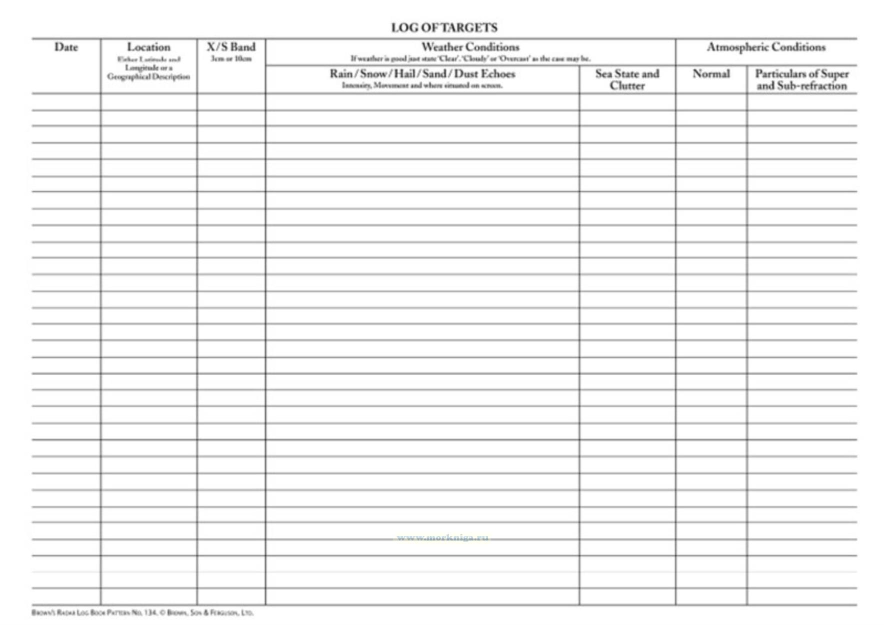 Brown, Son & Ferguson, Ltd. have produced such a Log Book. Starting with an introduction and two pages where the navigator can record details of the radar installation(s) (contained in the specification), it then consists of two parts: Log of Operations and Log of Targets. Each part contains 25 lined double-pages where the particulars specified at the top of the vertical columns can be written down by the officer who is in charge of maintenance or the navigator who actually is observing the radar display. The columns of the Log of Operations have the following printed headings: Date/ No Voyage/Type of Radar in Use/Periods of Use/ Location/Use for Navigation and/or Collision/Readings of Performance Monitors or Testmeters/Particulars of Unsatisfactory Performance/Repairs and/or Modifications/Remarks (Type of Weather, Ship Vibrations etc). The Log o f Targets contains columns for the following particulars: Date/Location/ X- or S- Band/Weather Conditions (Rain, Snow, Hail, Sand, Dust Echoes, Sea State and Clutter)/Atmospheric Conditions (Normal, Super- and Sub-Refraction)/Detection Range/identification Range/Radar Use as an Aid to Collision Avoidance and Navigation (Landfall, Coastal, Pilotage)/ARPA Performance (Acquisition and Tracking, Target Swop, Computer Saturation)/Remarks.