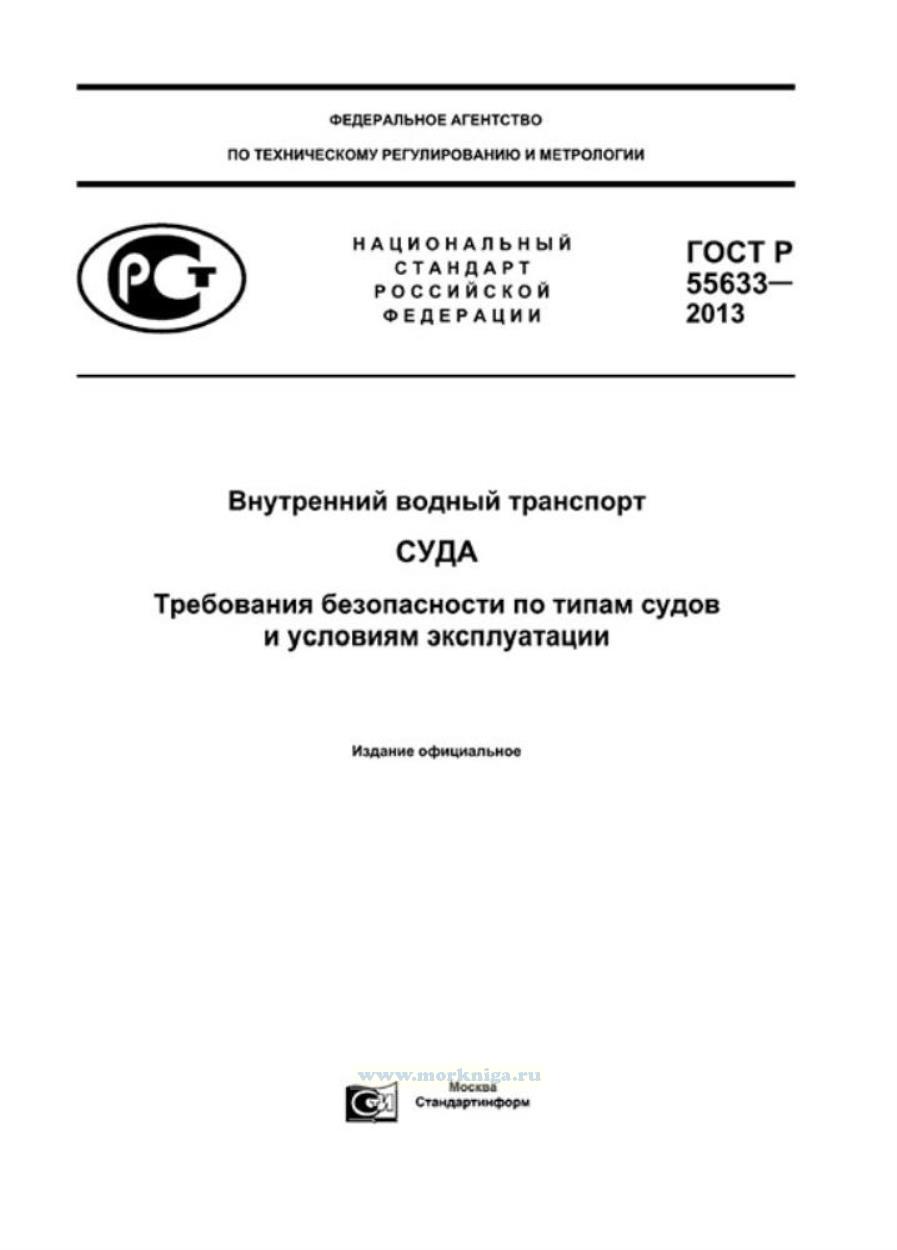 ГОСТ Р 55633-2013 "Внутренний водный транспорт. Суда. Требования безопасности по типам судов и условиям эксплуатации" утв. и введен в действие Приказом Федерального агентства по техническому регулированию и метрологии от 14 октября 2013 г. N 1158-ст
